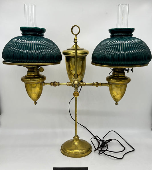 Victorian Emerald Green Ribbed Brass Double Student Lamp 1870's