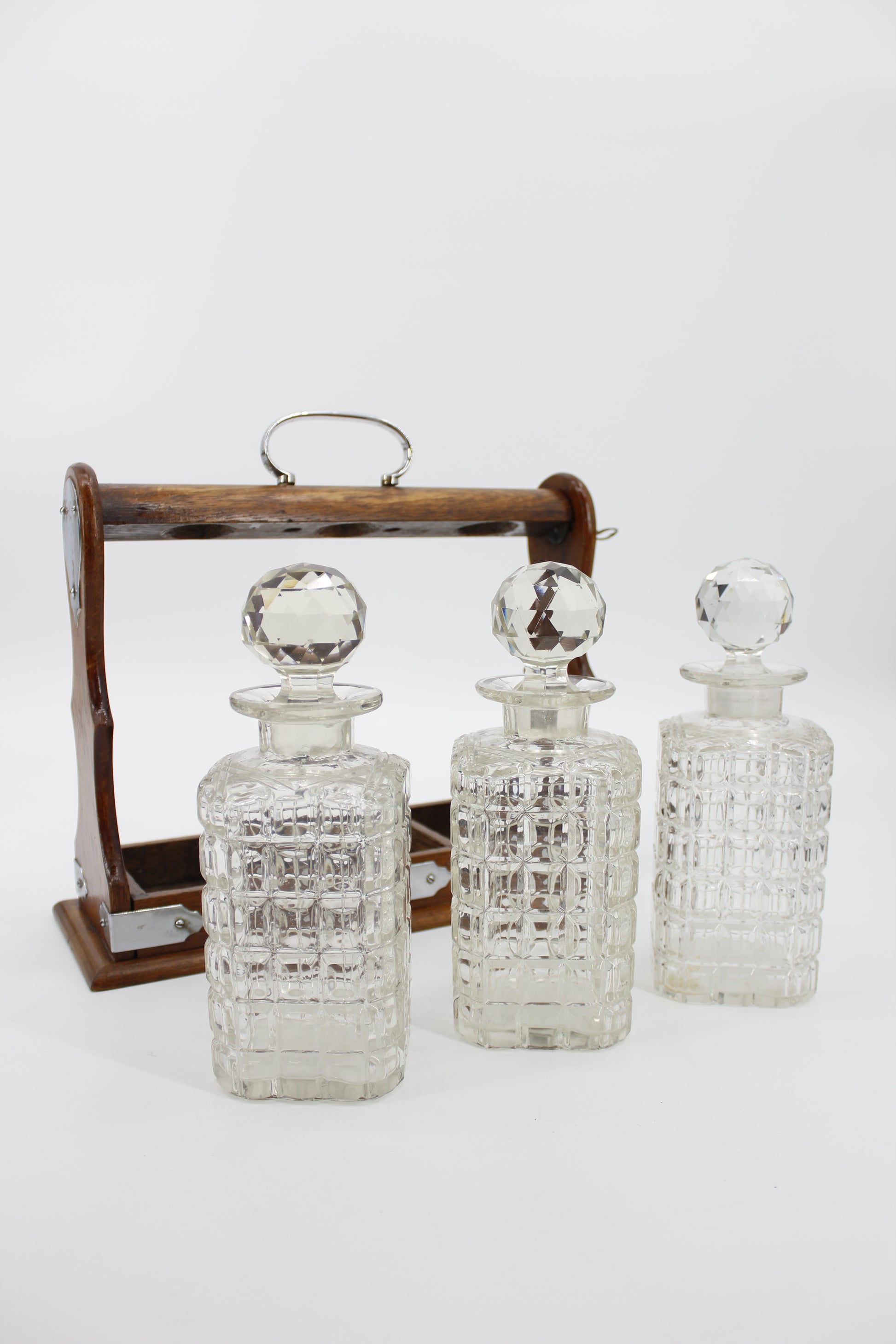 First introduced in the latter half of the 19th century, the tantalus was patented in 1881 by German cabinet maker George Betjemann. Its purpose was to prevent unauthorized access to expensive liquors such as whiskey, brandy, and cognac. When the oak frame is in the upright, locked position, the decanters cannot be removed—making it an effective deterrent against theft by servants or uninvited guests.