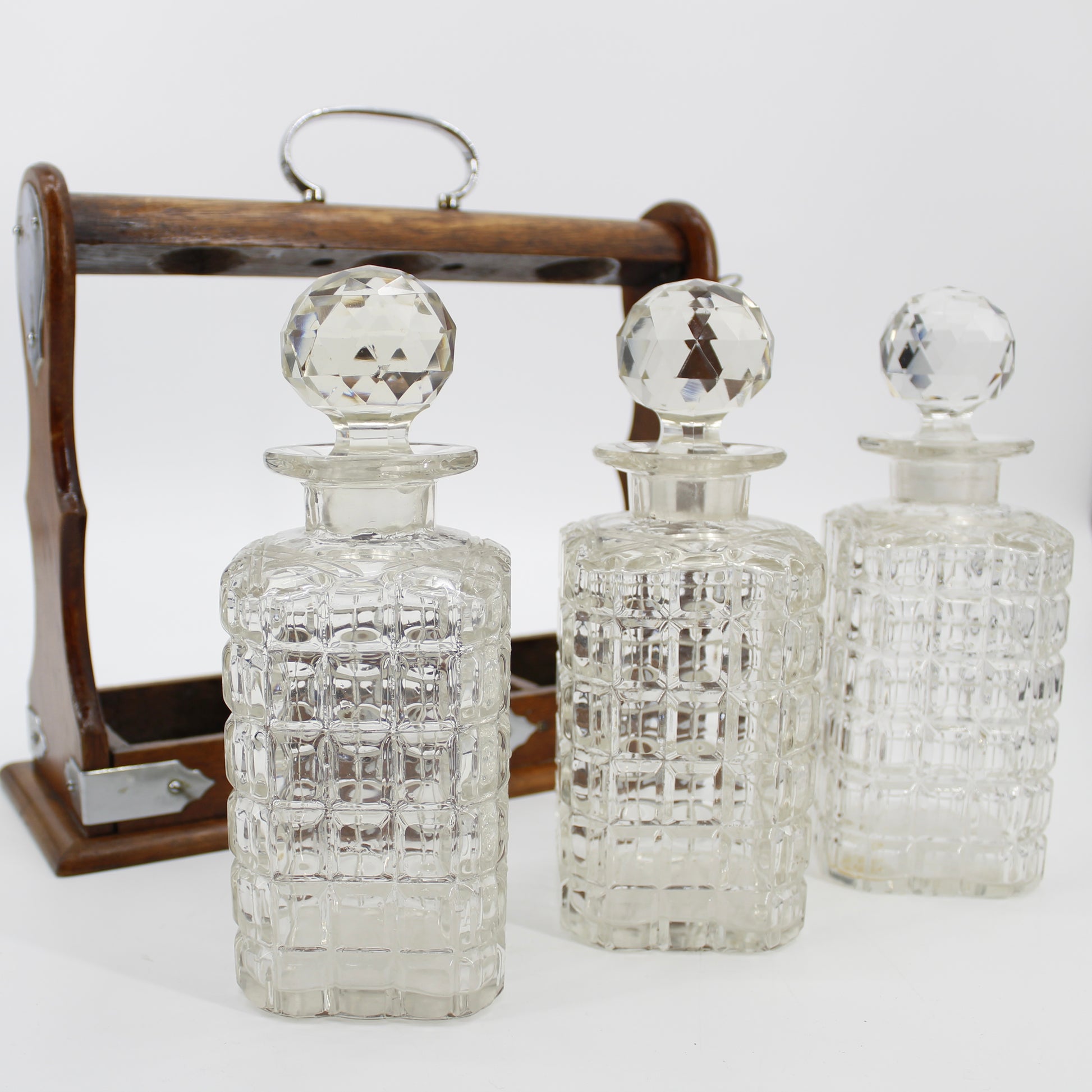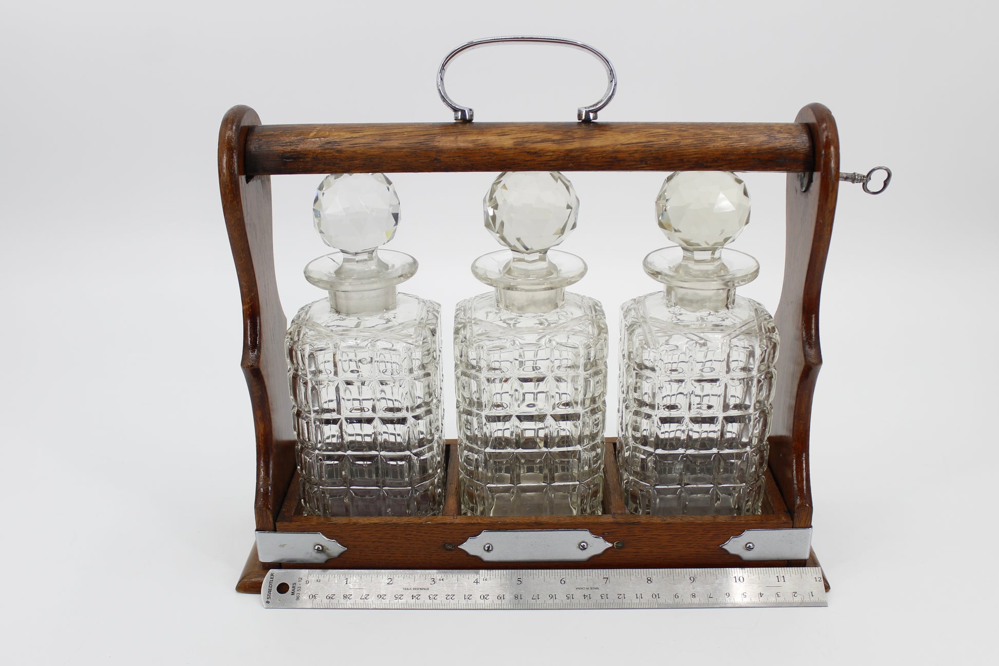 This elegant antique makes a distinguished display piece for any bar or collection. It includes three crystal decanters, secured in an oak frame adorned with nickel-plated brass accents throughout. This tantalus comes with the original, working key.