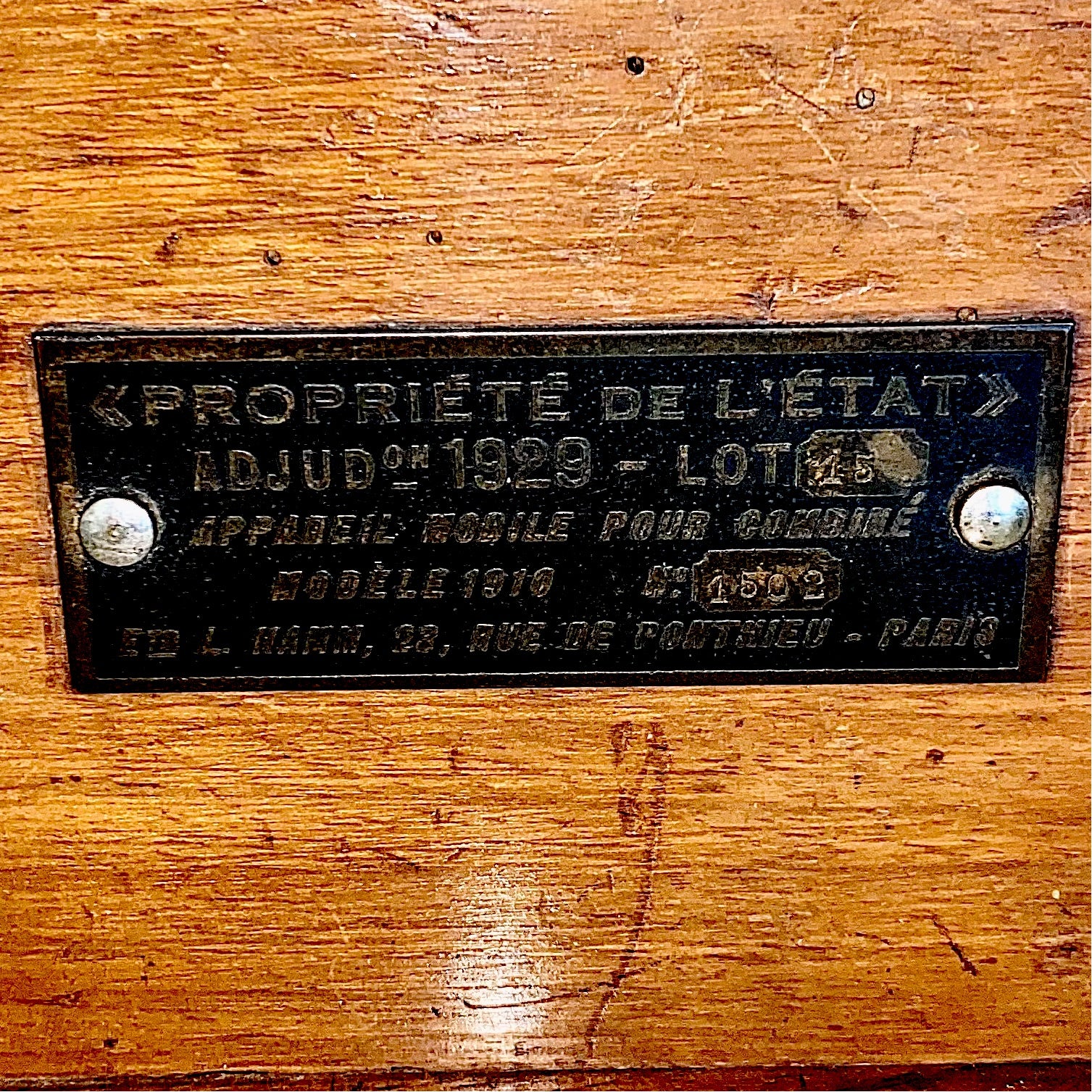 Plaque indiquant : << PROPRIETE L'ETAT, ADJUD ON 1929 LOT 15, APPAREIL MOBILE POUR COMBINE, MODELE 1910 No. 1502, ETS L. HAMM, RUE DE P;ONTHEIU- PARIS'