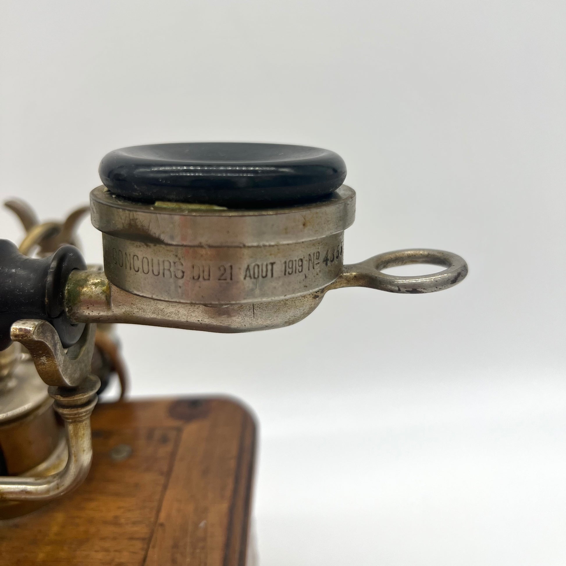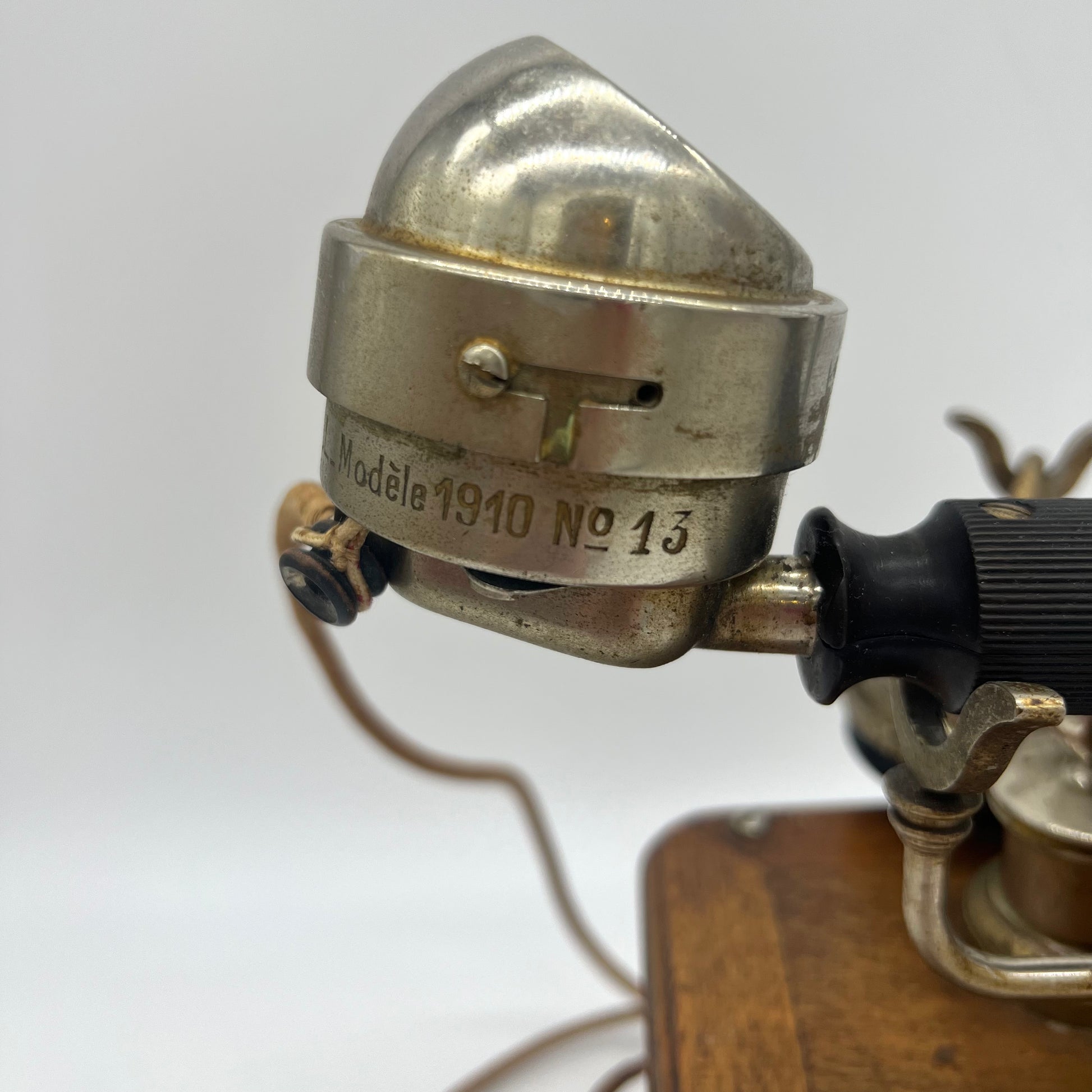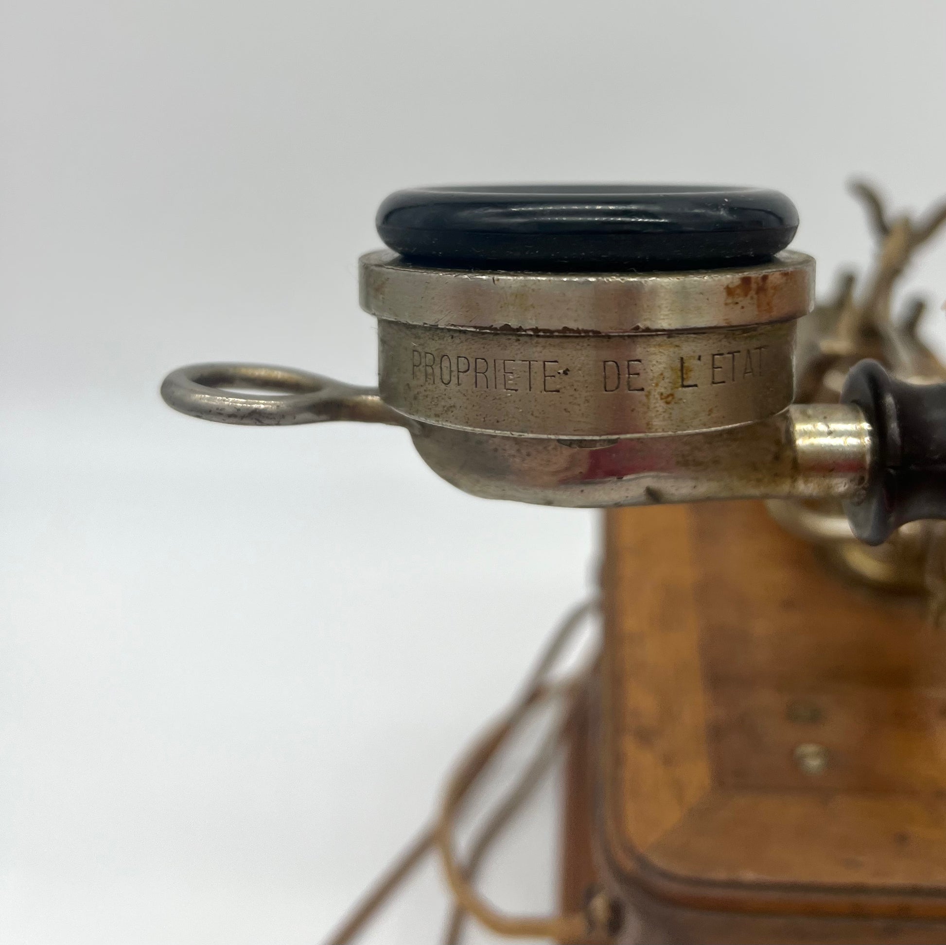 Téléphone de bureau français ancien. Boîtier en chêne abritant un générateur à manivelle. Socle nickelé. Fil d'origine. Innovant pour l'époque, ce téléphone particulier est doté d'un écouteur supplémentaire qui permet à une deuxième personne d'entendre la conversation. Téléphone à socle en chêne et laiton. Non restauré.
