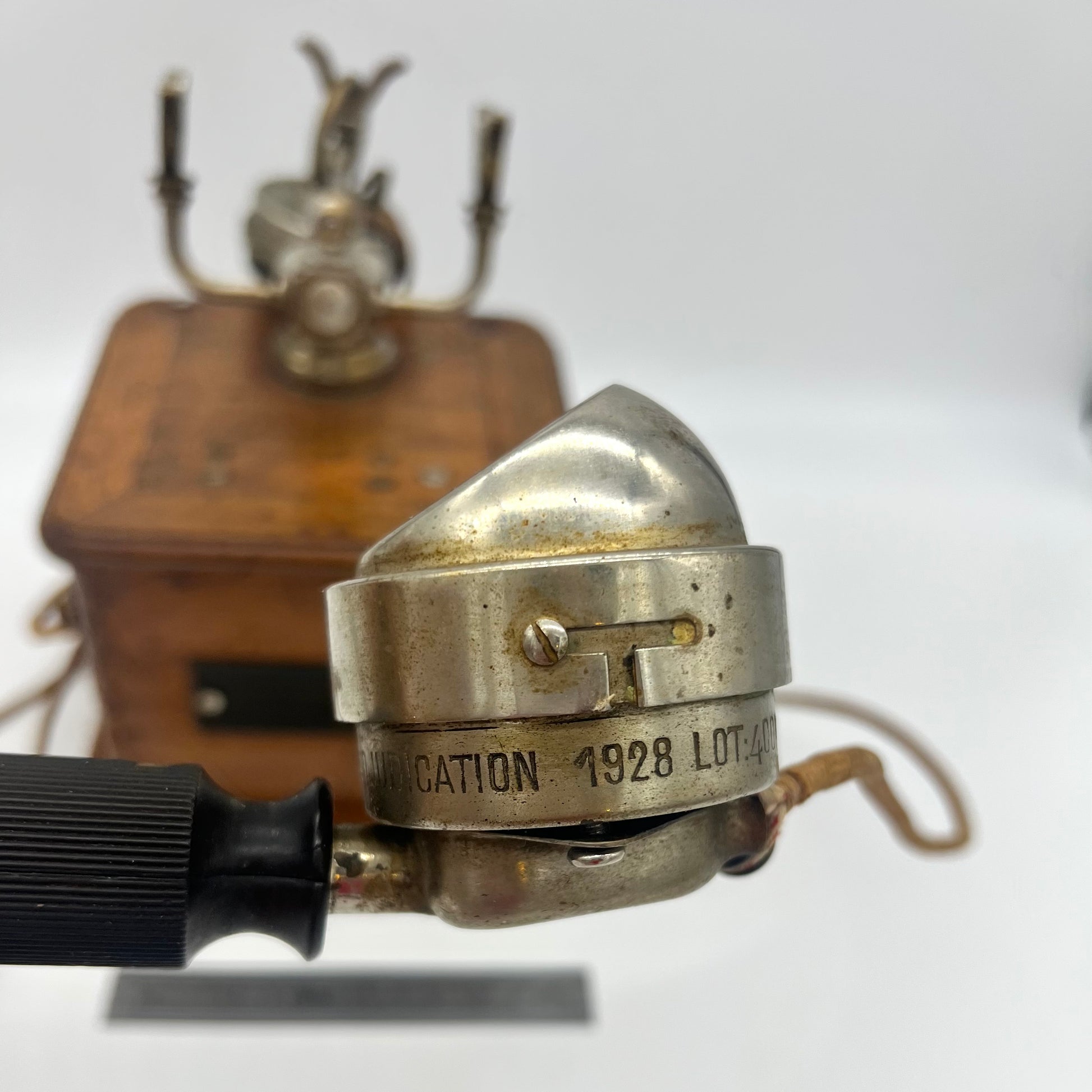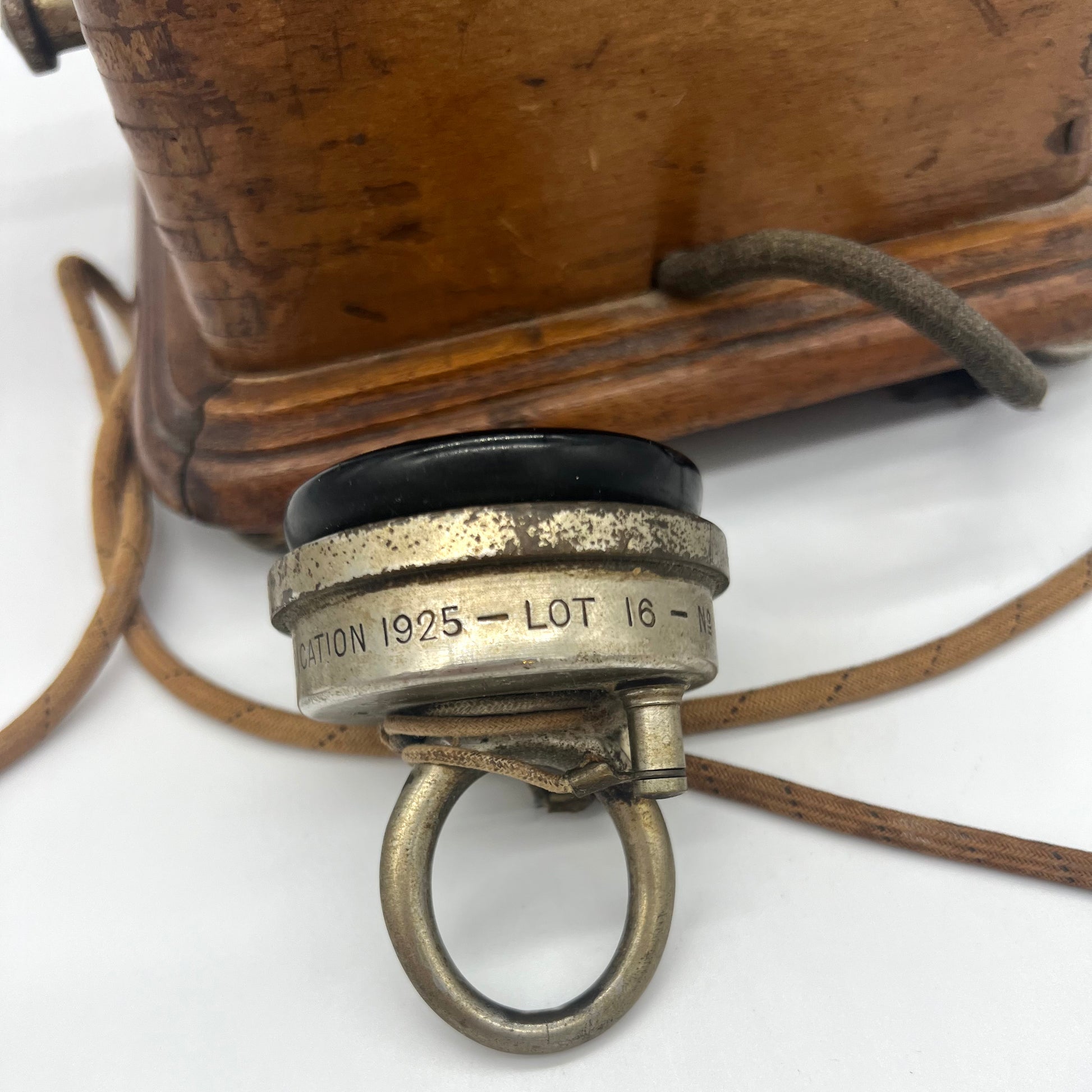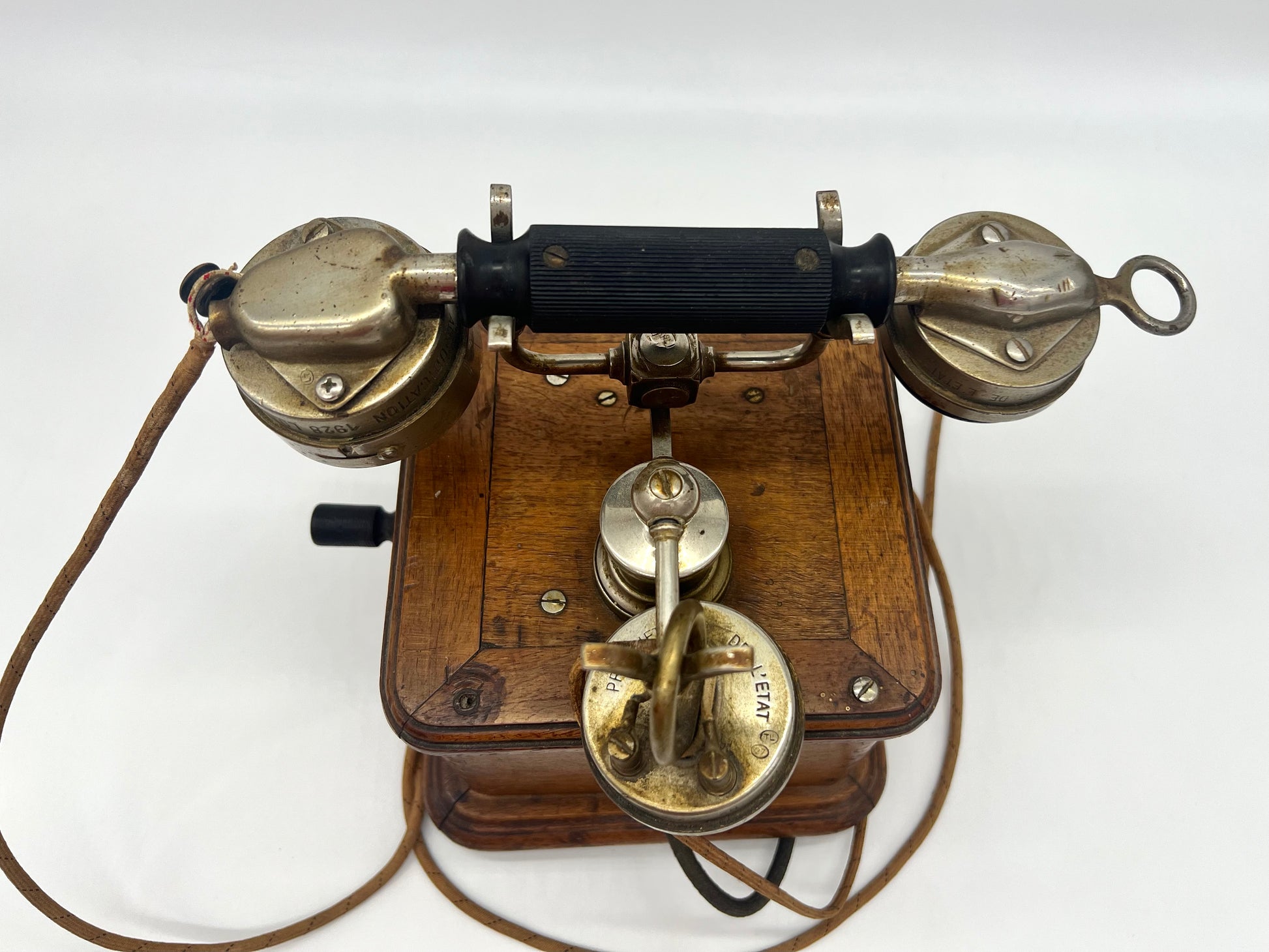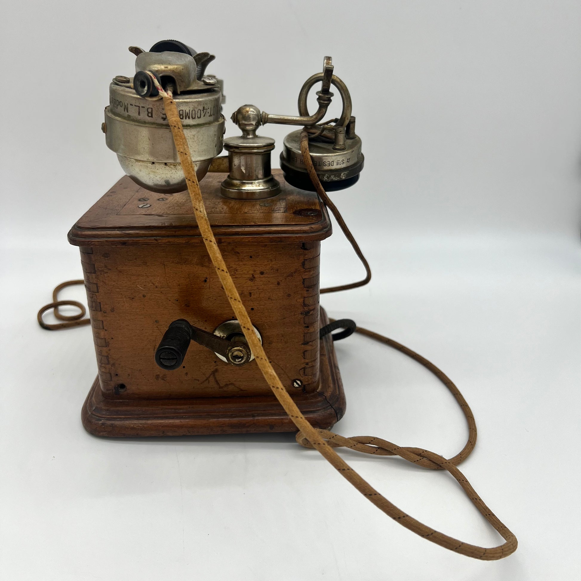 Téléphone de bureau français ancien. Boîtier en chêne abritant un générateur à manivelle. Socle nickelé. Fil d'origine. Innovant pour l'époque, ce téléphone particulier est doté d'un écouteur supplémentaire qui permet à une deuxième personne d'entendre la conversation. Téléphone à socle en chêne et laiton. Non restauré.