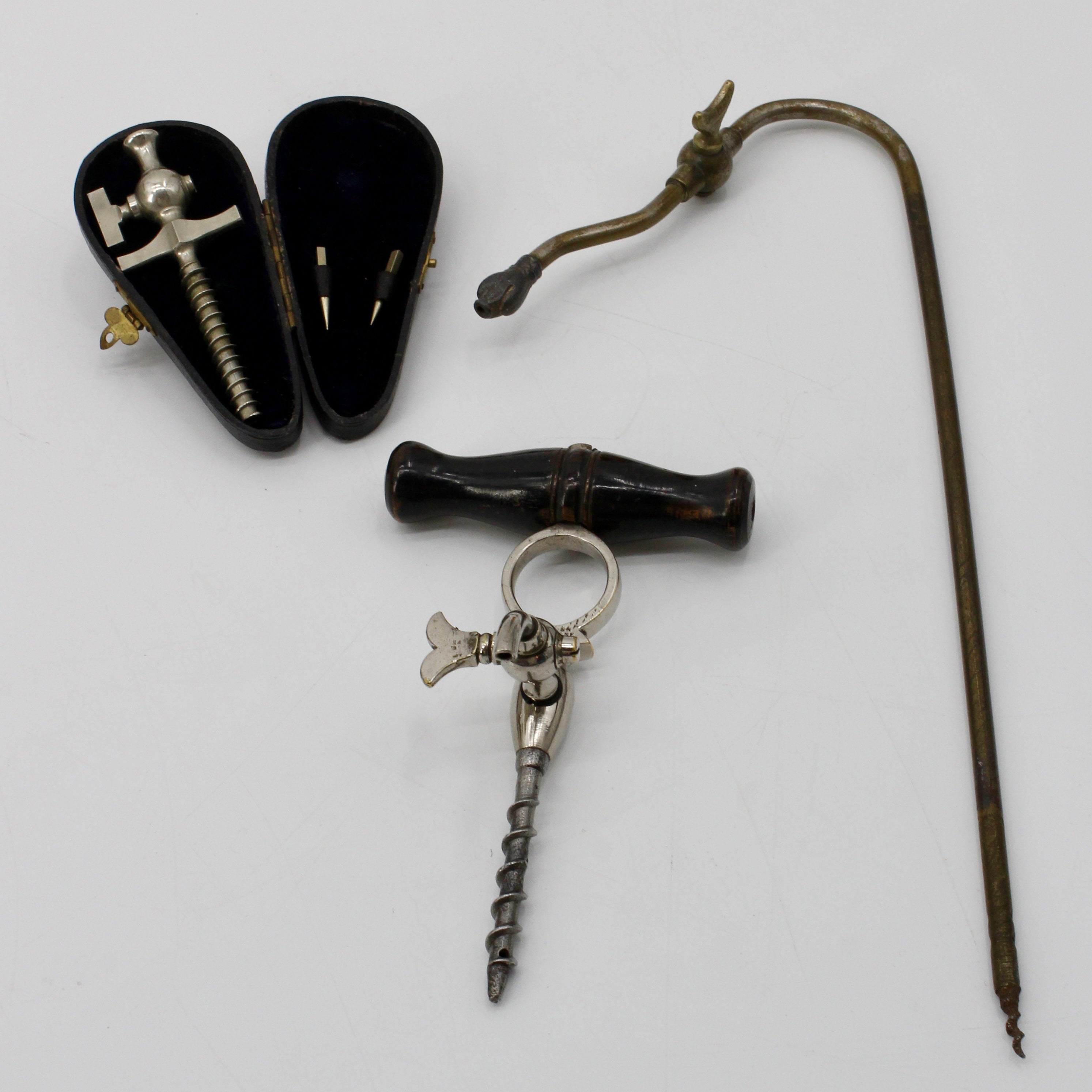 A 19th-century English silver-plated Milne champagne tap, in its original velvet-lined, fitted leather case with two drop pins. The Milne drop-point mechanism releases the spike into the bottle once the cork is pierced, allowing champagne or seltzer to be drawn while preserving carbonation for future use. Dating to the late 1800s, this is a rare and elegant piece of Victorian barware and a striking collectible.