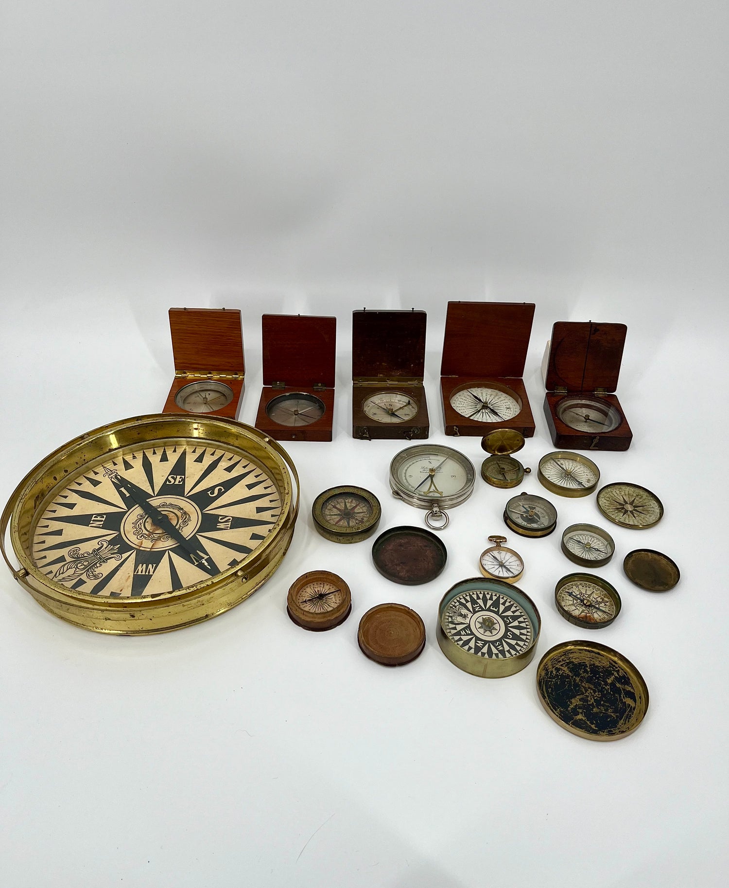 A rare collection various European and American antique pocket & wooden folding compasses dating from the 1700's to 1800's.