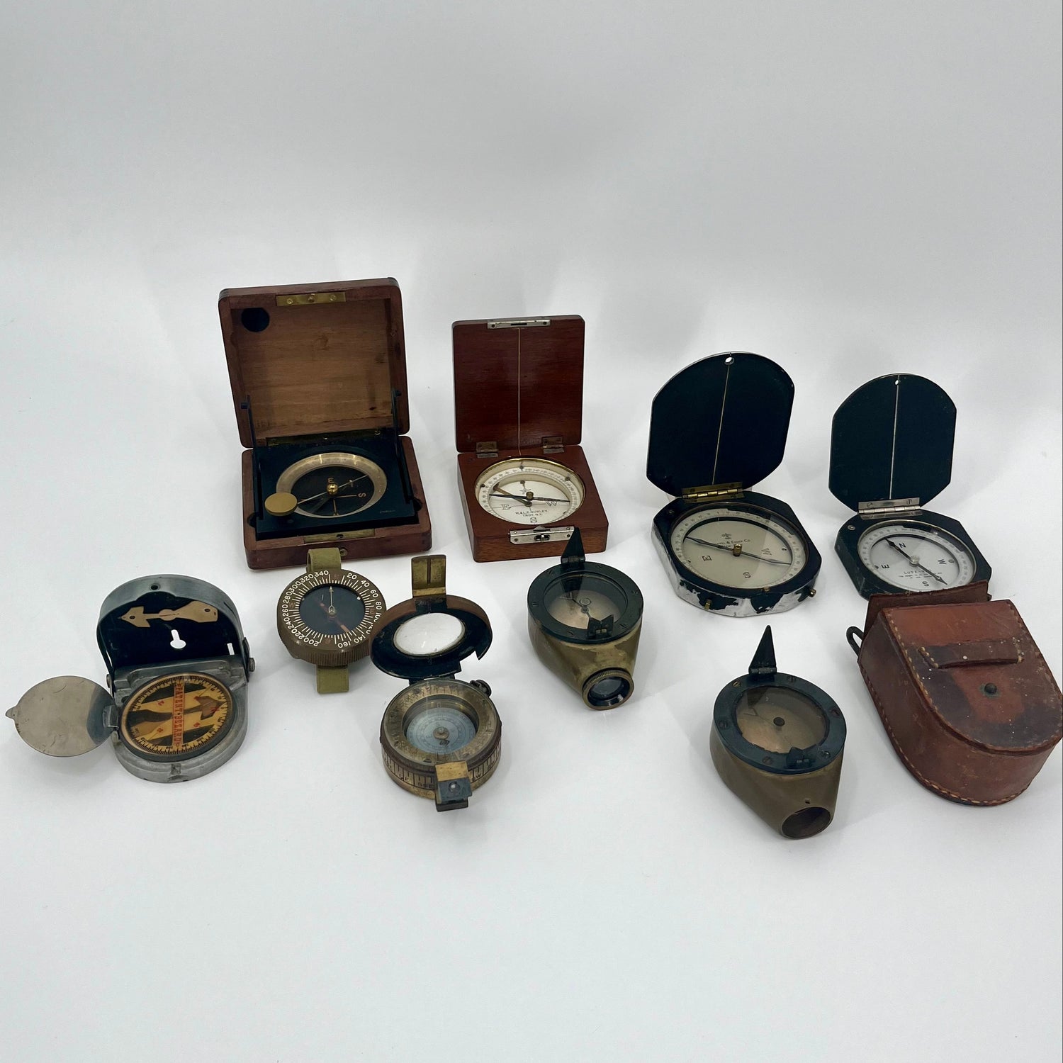 A wide range of various surveyors compasses from Europe & America dating 17th to 20th centuries.