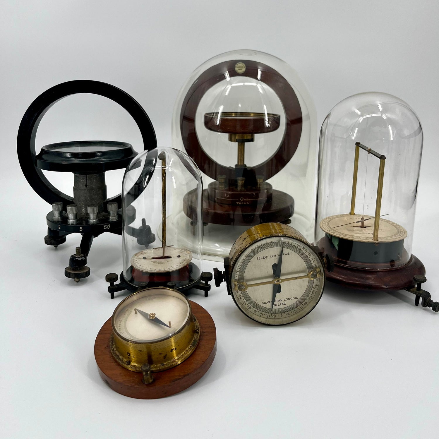 An interesting collection of astatic and tangential galvenometers.