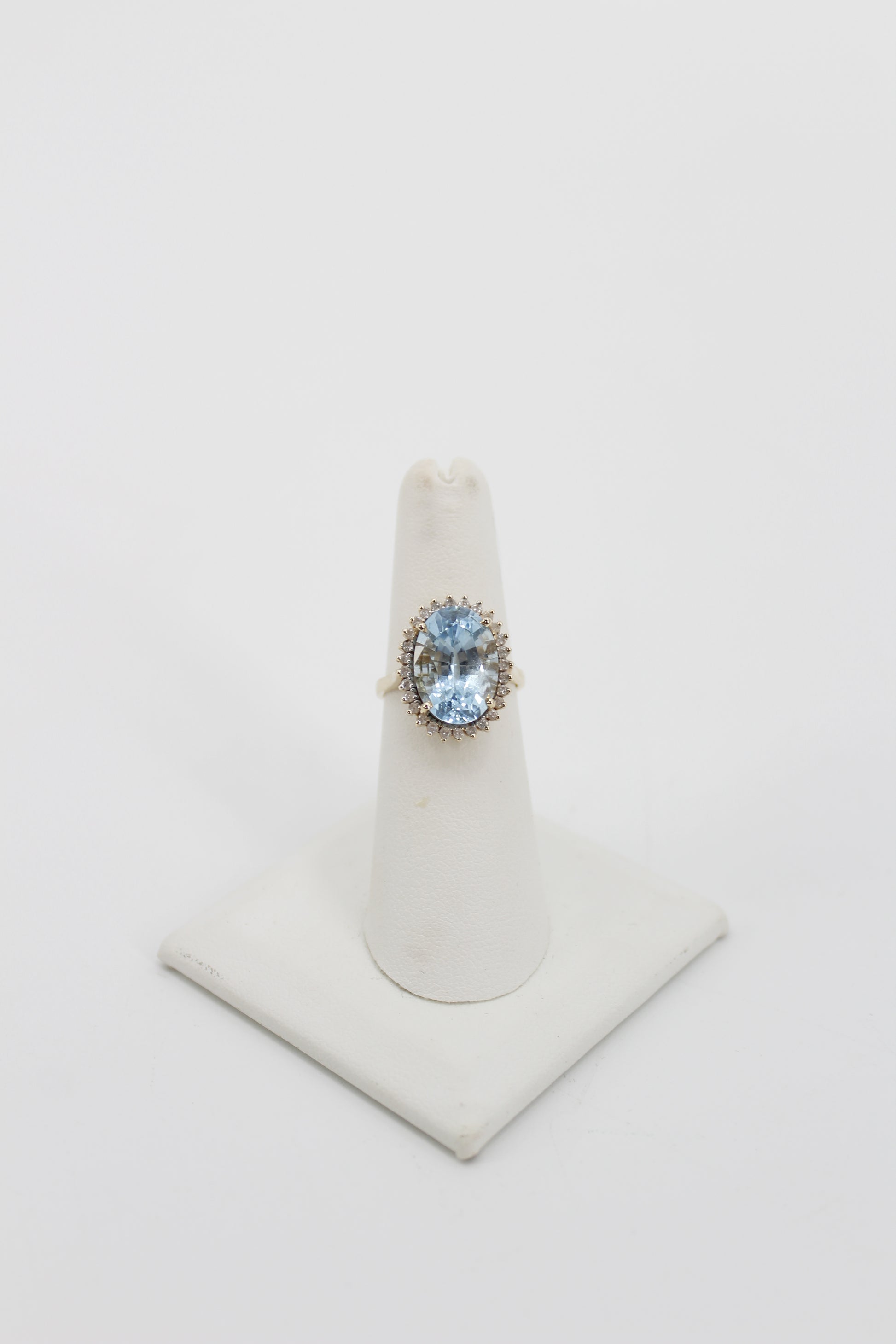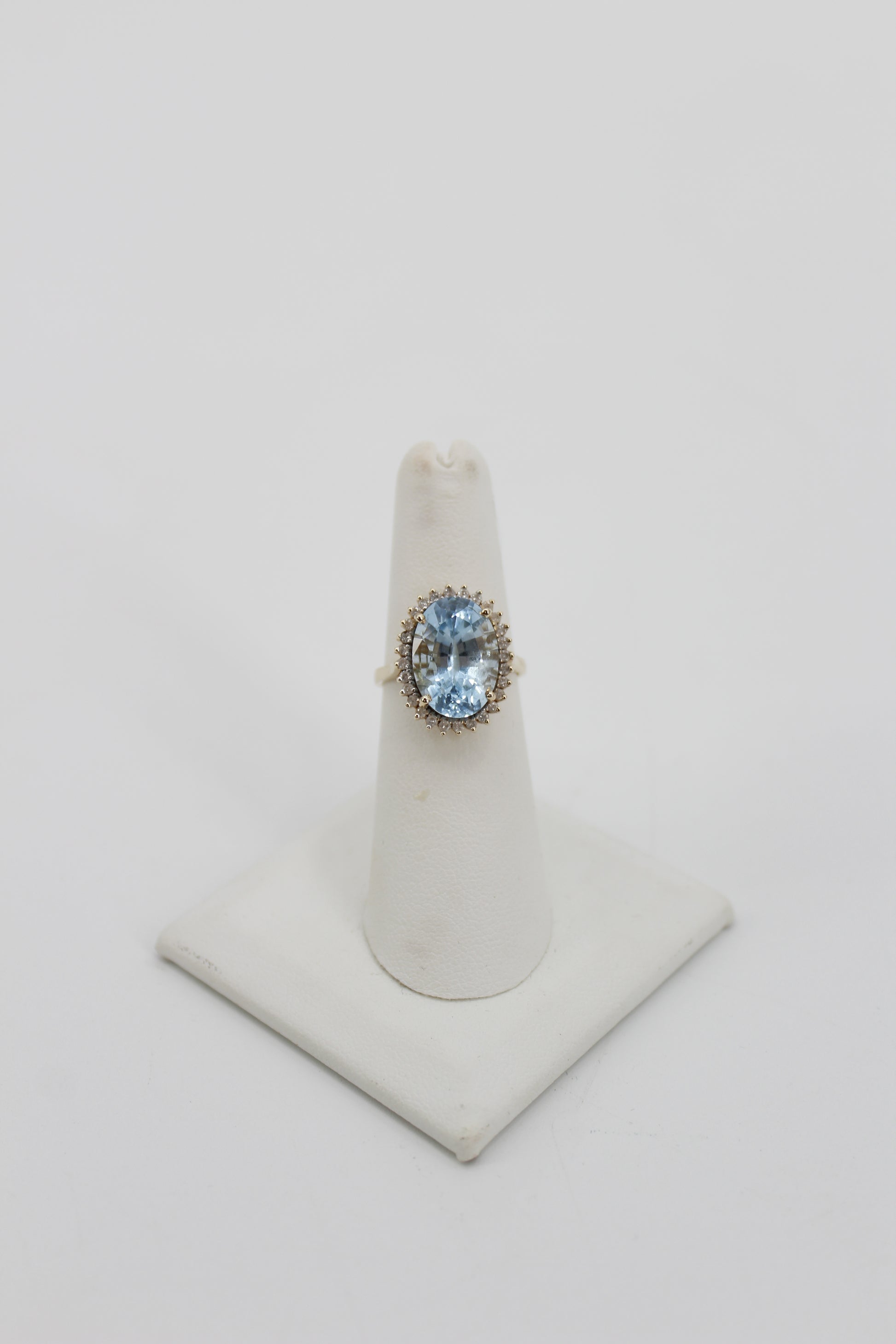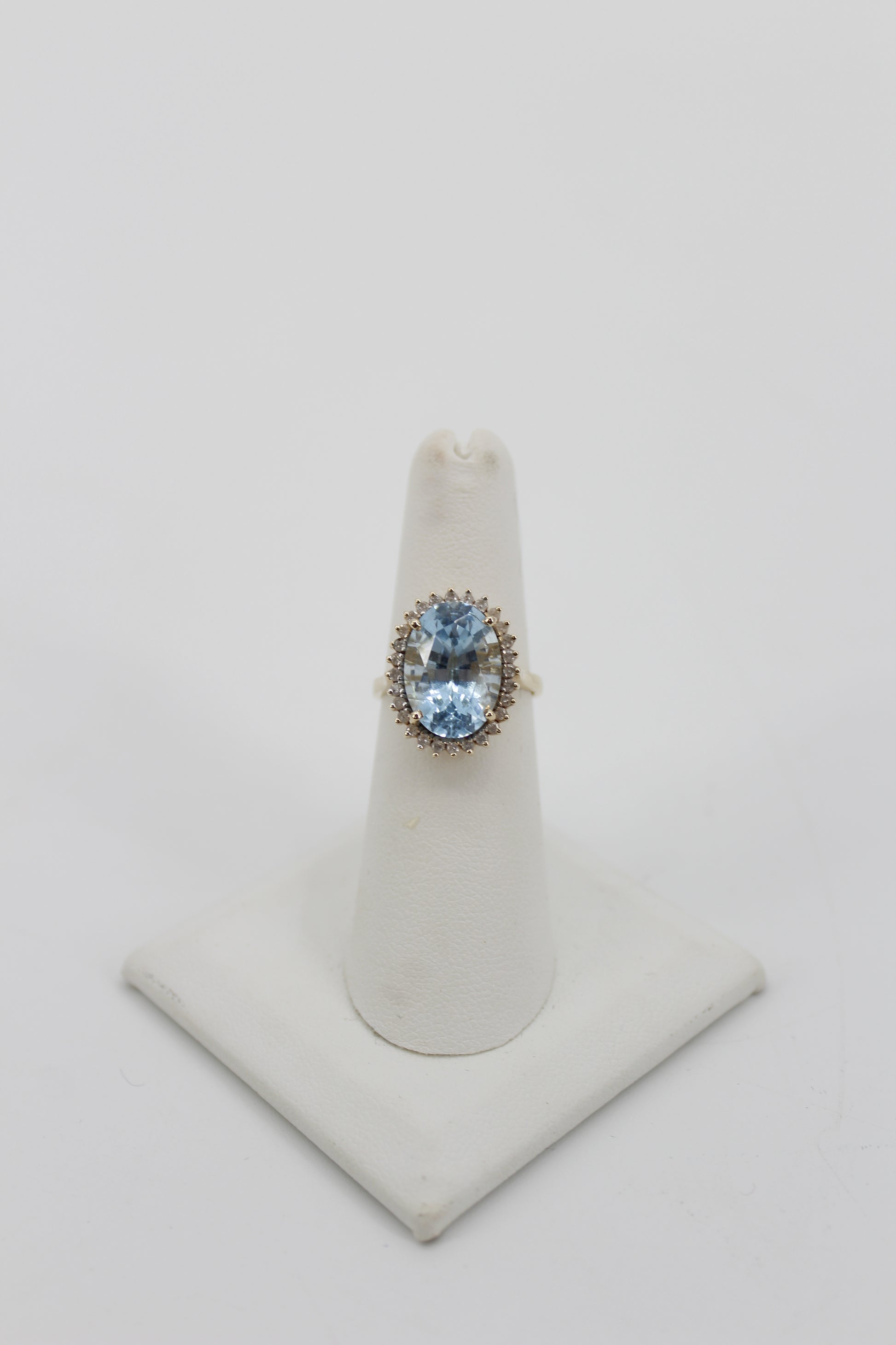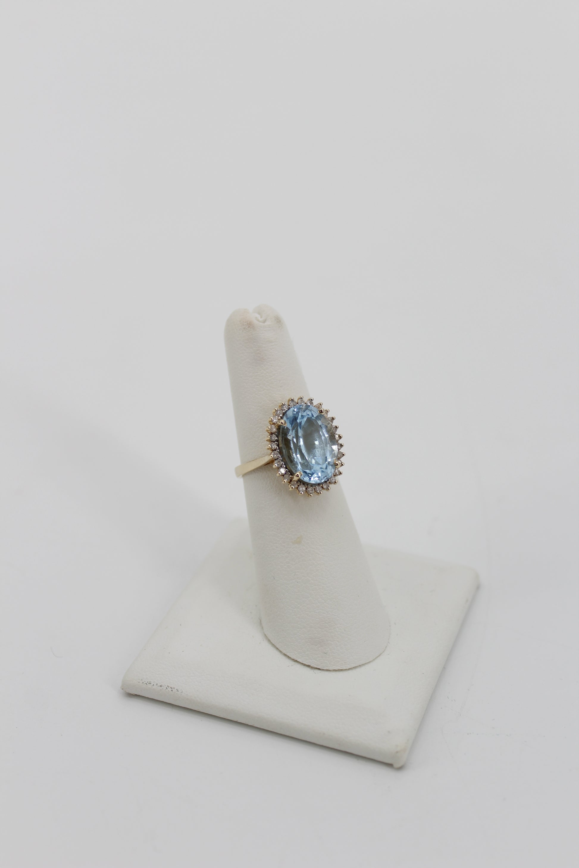 A large 8-carat, oval-cut brilliant Blue Topaz takes center stage, surrounded by a dazzling 30-diamond halo. Handcrafted in Great Britain, this ring features all prong-set, Earth-mined gemstones meticulously set in a rich 14K yellow gold. A testament to true craftsmanship, these natural & uniform diamonds have been expertly color-matched to create a vivid and uniform display. A true show-stopper with a timeless design, this piece was created to be adored by generations to come.