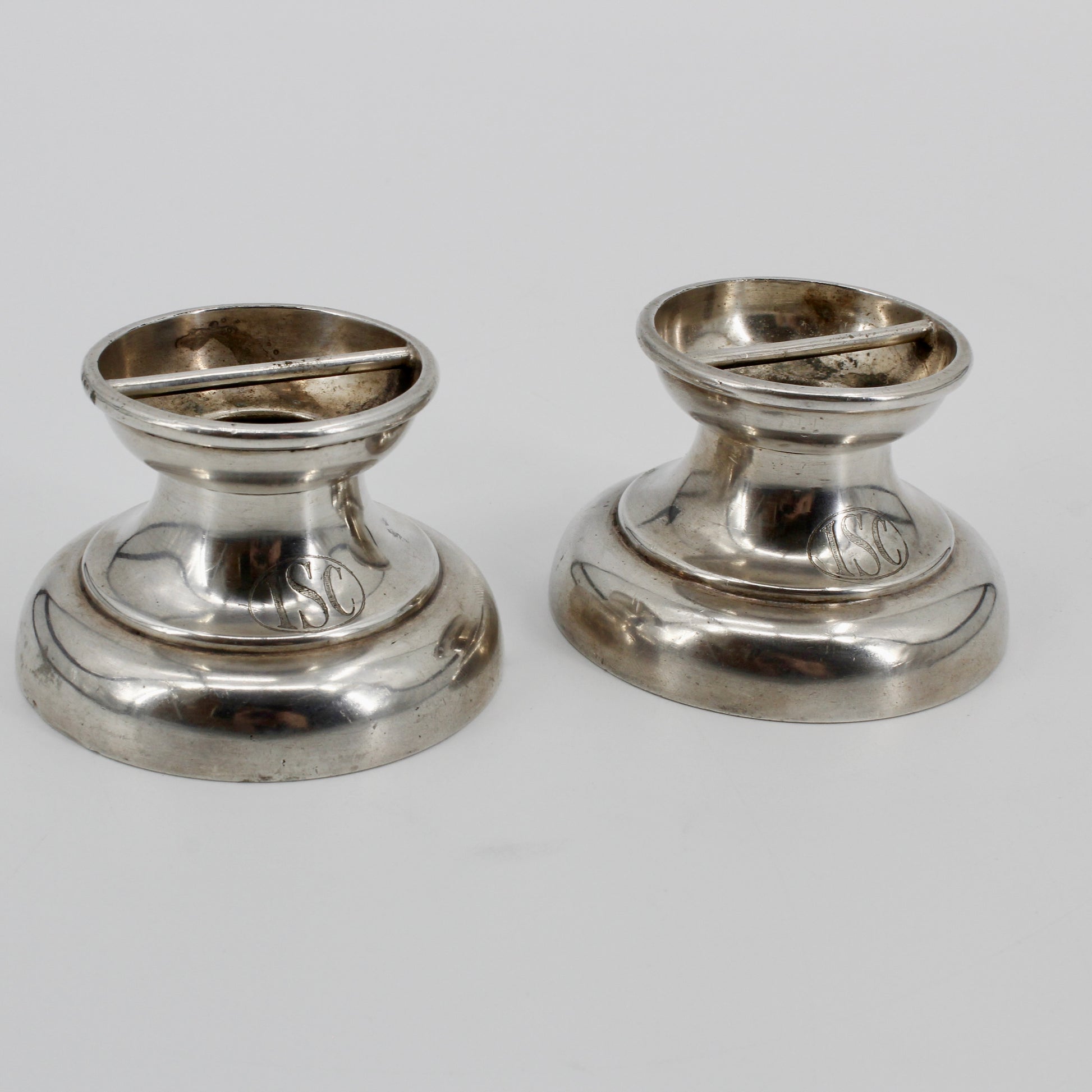 A matching monogrammed pair of triple silver-plated cigar rests by Mappin & Web. Likely from a gentlemens/country club, rests contain ashtrays.