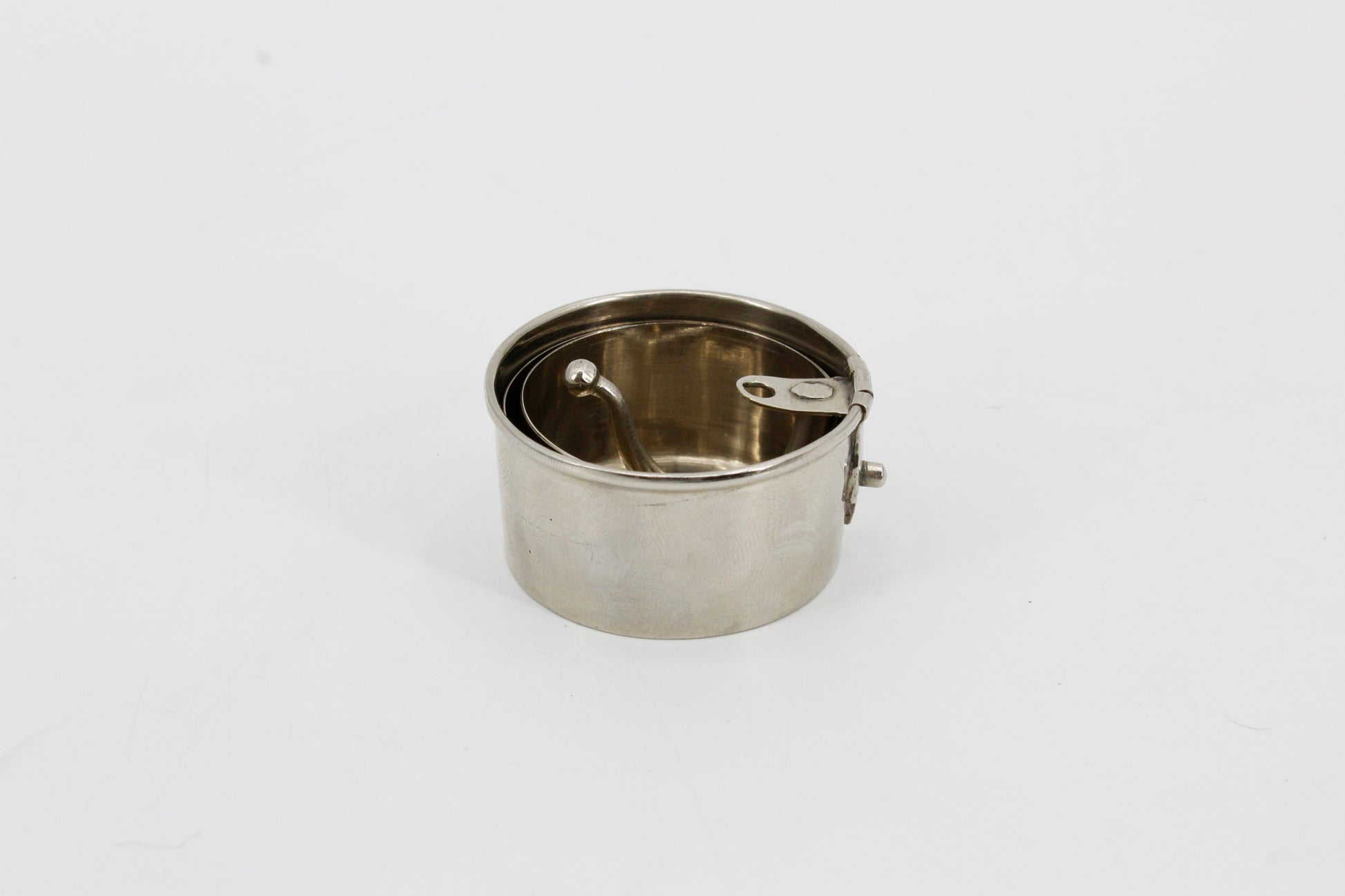 Often used on fox hunts in the Victorian era; This telescoping, collapsible shot glass features a push-lock handle-mechanism for safe carrying. Functional & interesting antique, retaining water-tight seal when assembled for safe drinking. Polished metal. Unsigned, circa 1900.