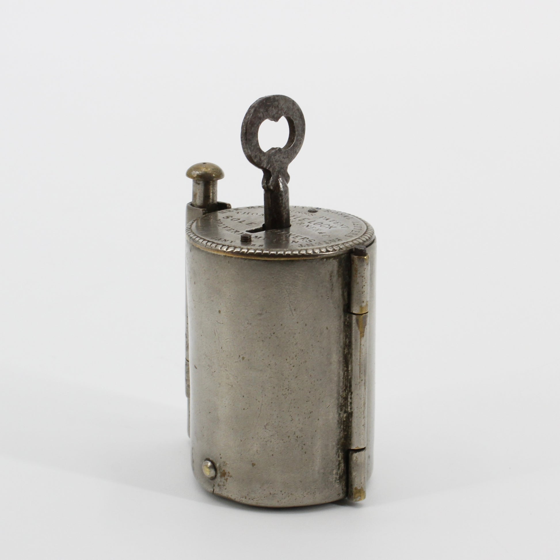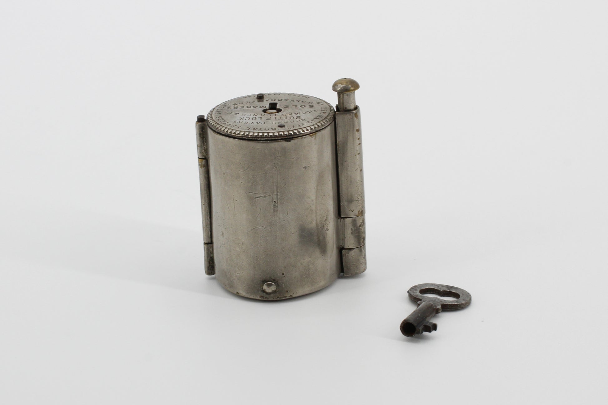 This excellent & scarce Burns's Patent Bottle Lock & Key Set is a remarkable find. Granted "Her Majesty's Royal Letters Patent" by Queen Victoria in January of 1881, Thomas Turner & Co. was the sole maker of this mechanism. Designed to keep servants from partaking in libations, this lock & key set continues to function as originally designed. Manufactured in Wolverhampton, UK. Fits regular size liquor and wine bottles. Nickel plated brass with steel key, spring bolt and spring grips.