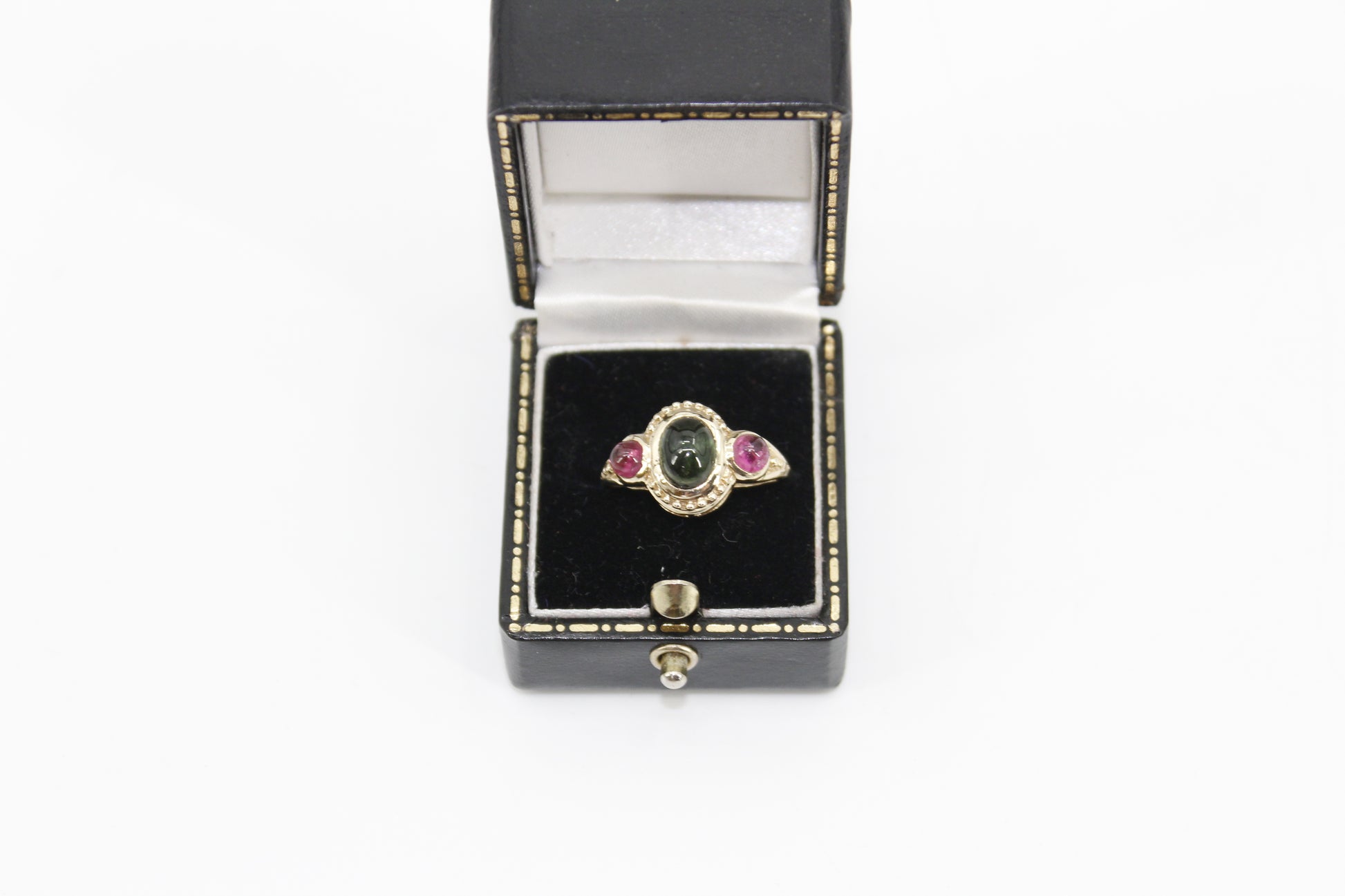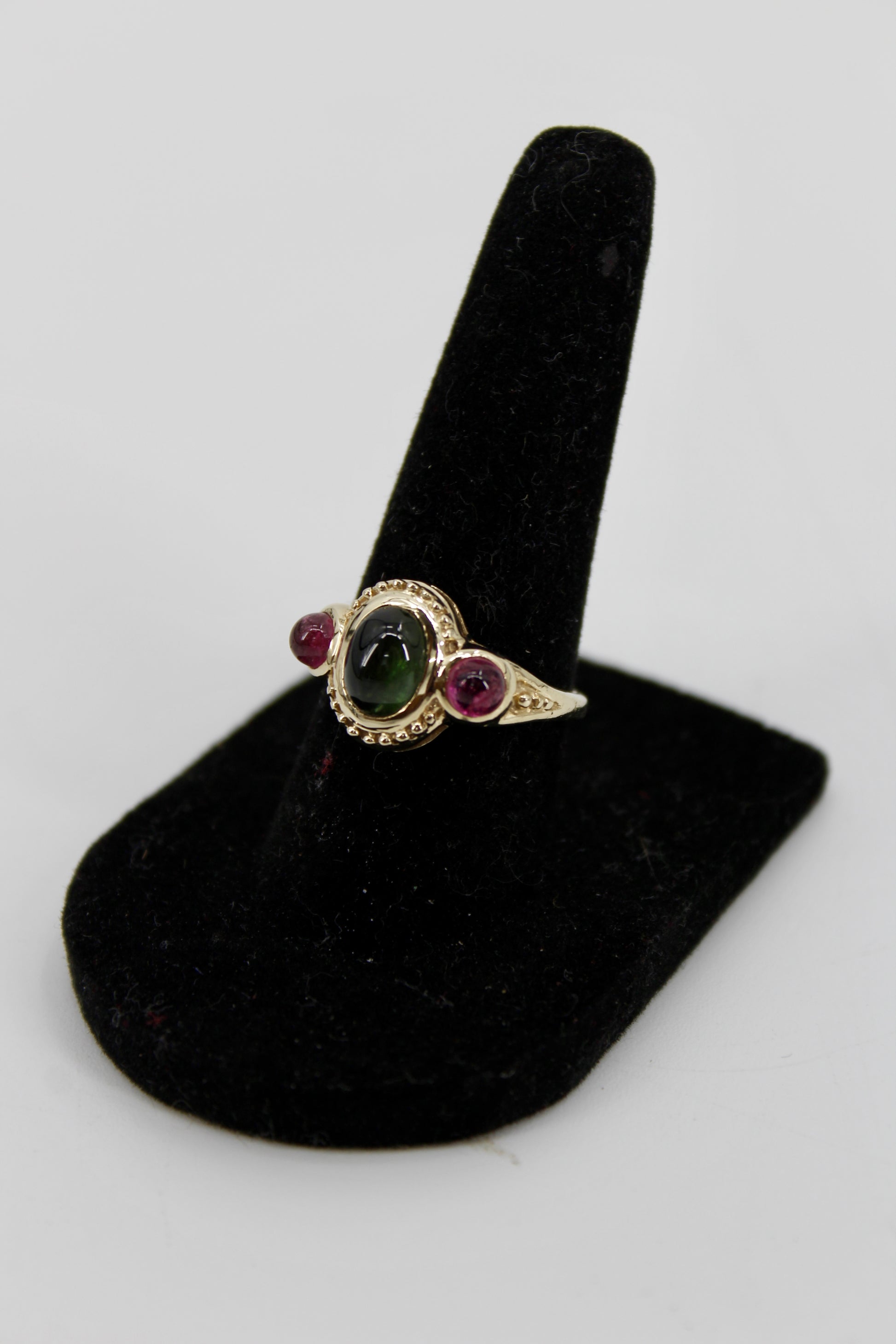 This Victorian piece was made in homage to ancient Roman times. The beautiful choice of cabochons in this piece create an ever-enduring style that would not look out of place from ancient times through today. More than 1.25-carats in the center oval-cut Green Tourmaline, flanked by 0.42-carat Pink Tourmalines. Natural, untreated gemstones. Expertly set in era-appropriate 10K yellow gold. The interesting, knurled border adds to the organic and timeless aesthetic.