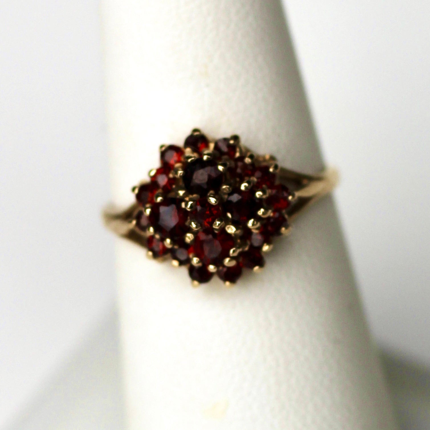 Exquisite Victorian era Garnet Cluster Ring. Featuring a dazzling array of 21 faceted, natural, round-cut Garnets. This timeless piece contains over a carat and a half of Garnets, and is set in lovely, age-appropriate 9K yellow gold. Skillfully handcrafted in England, circa late 1800's. These carefully chosen stones are beautifully uniform in color, with excellent refractivity. At over 150 years old, this wearable piece of history is a testament to excellent craftsmanship- whose quality has continued to guarantee its durability for generations to come.
