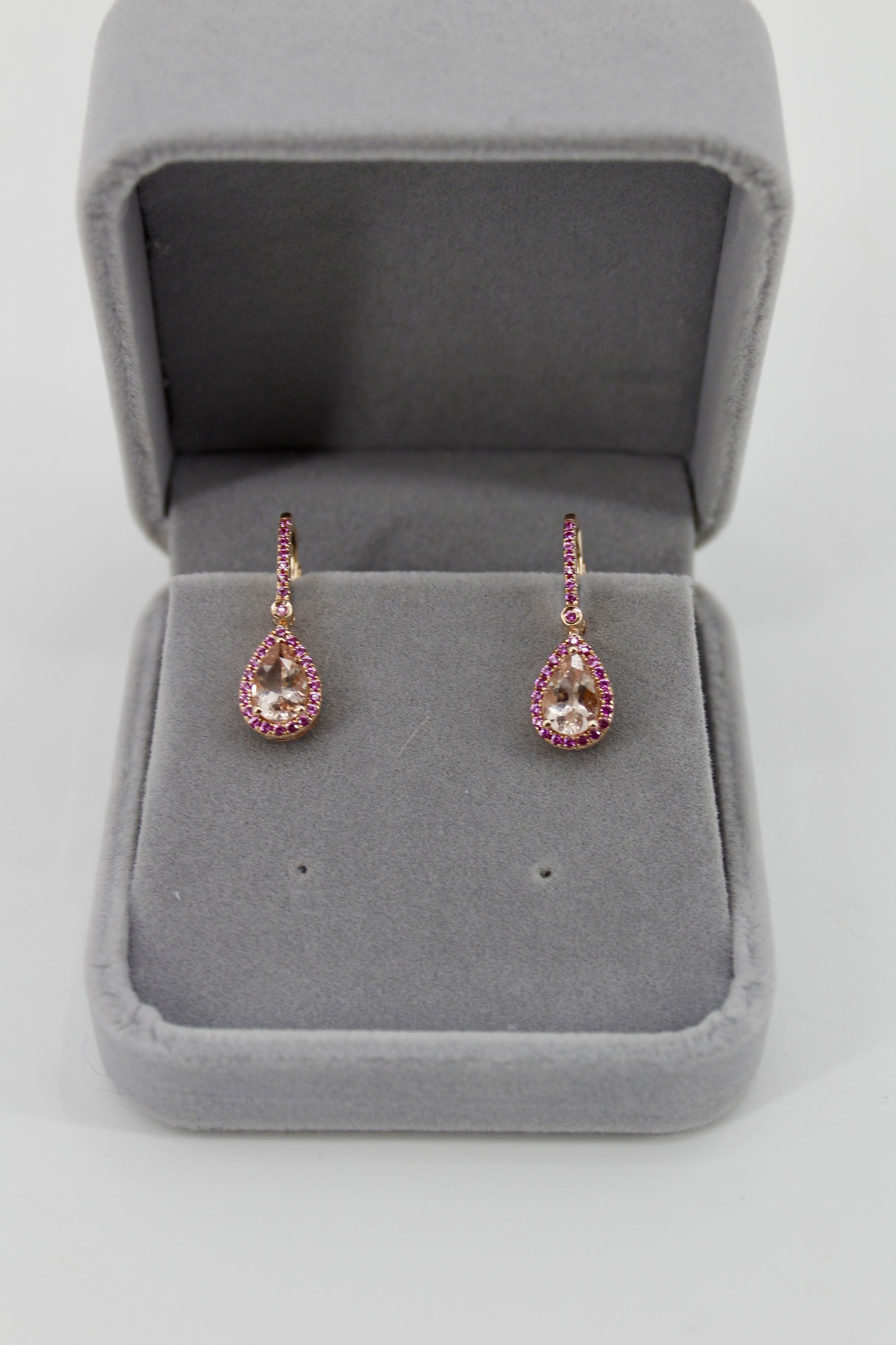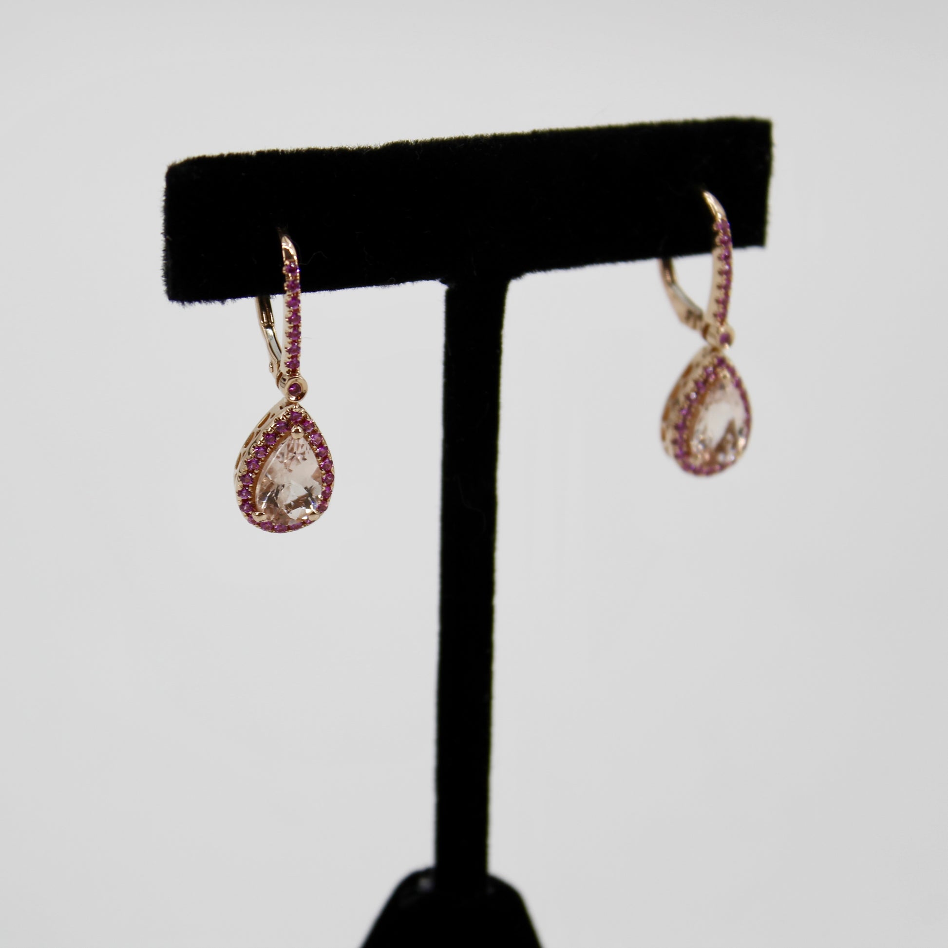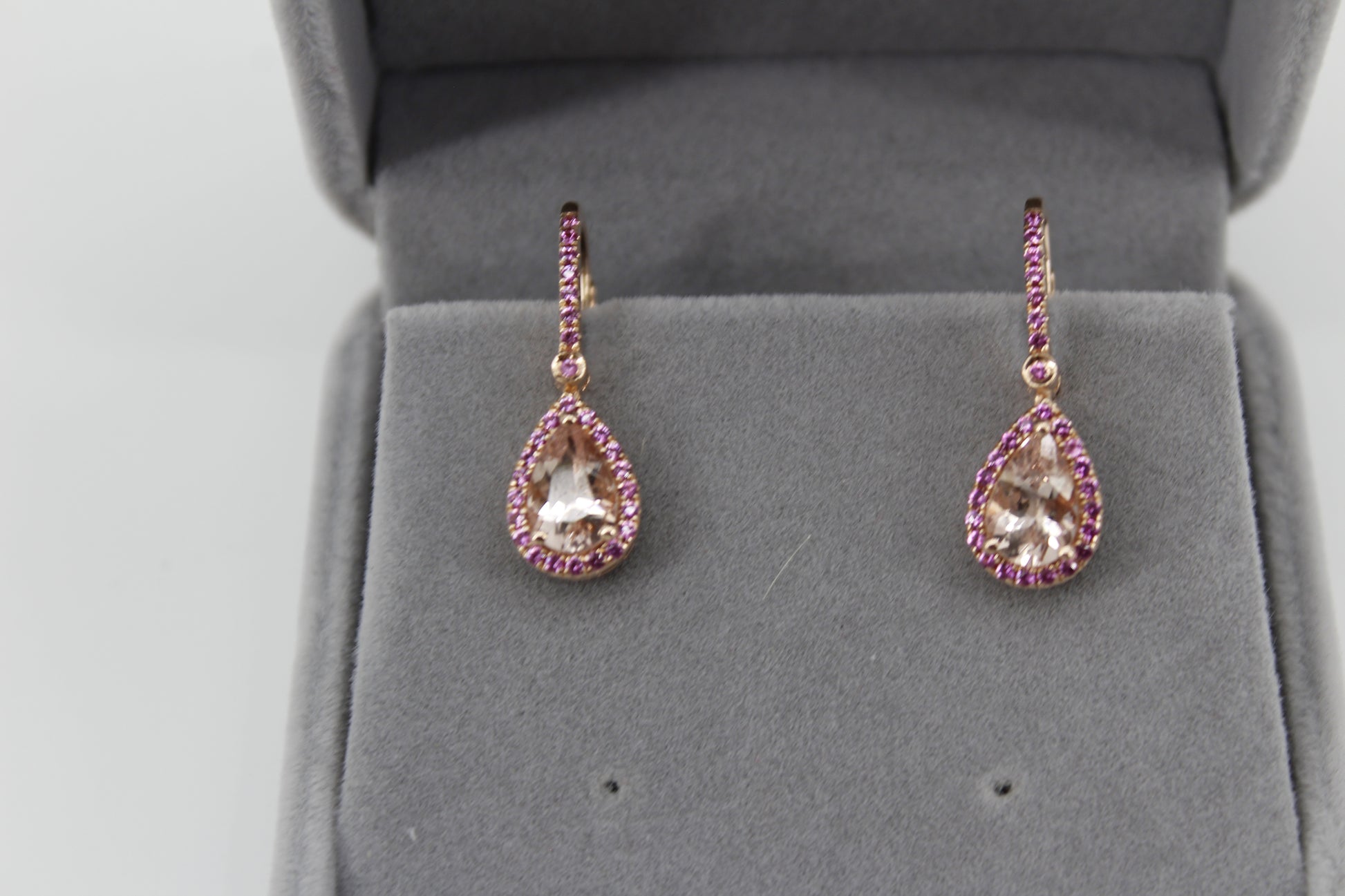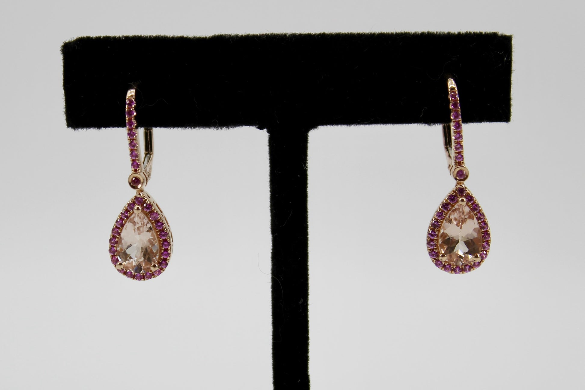 Over 3-carats of brilliant, pear-cut Morganite. Each large Morganite is surrounded by a halo of 20 Pink Sapphires, attached to a 7-stone stem, with a 1.7mm Sapphire connecting the two. Perfectly set in a rich 14K rose gold.