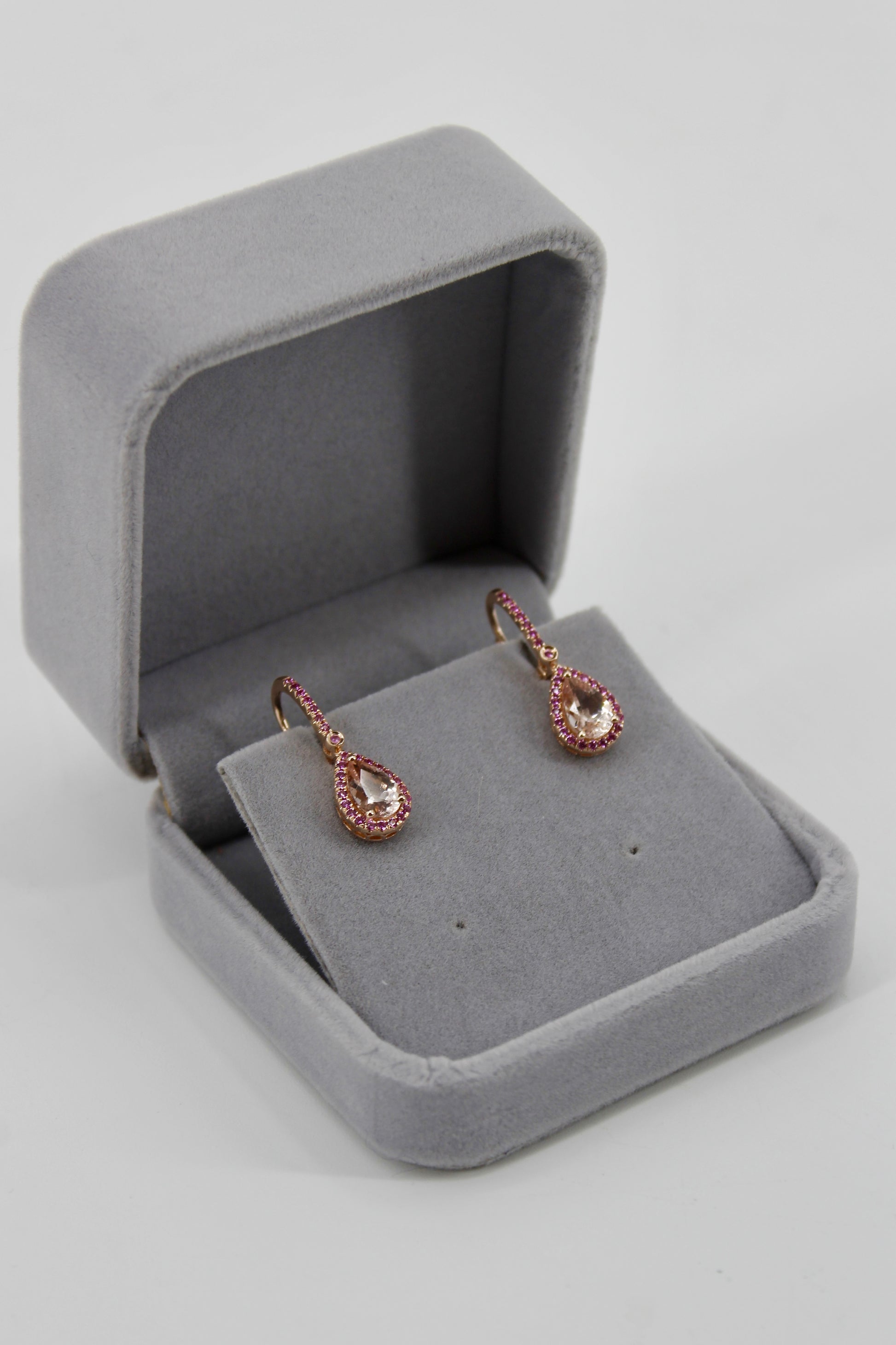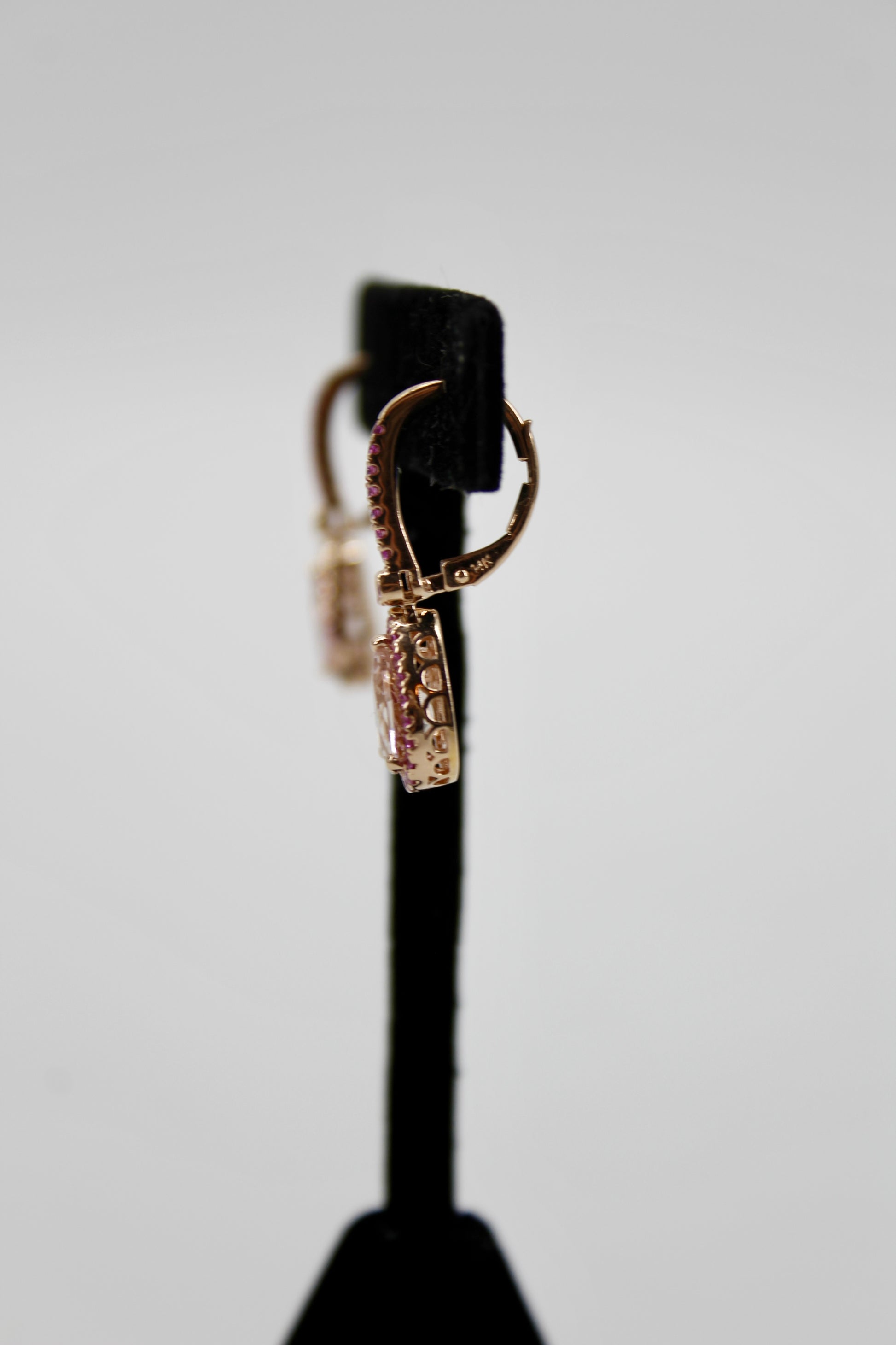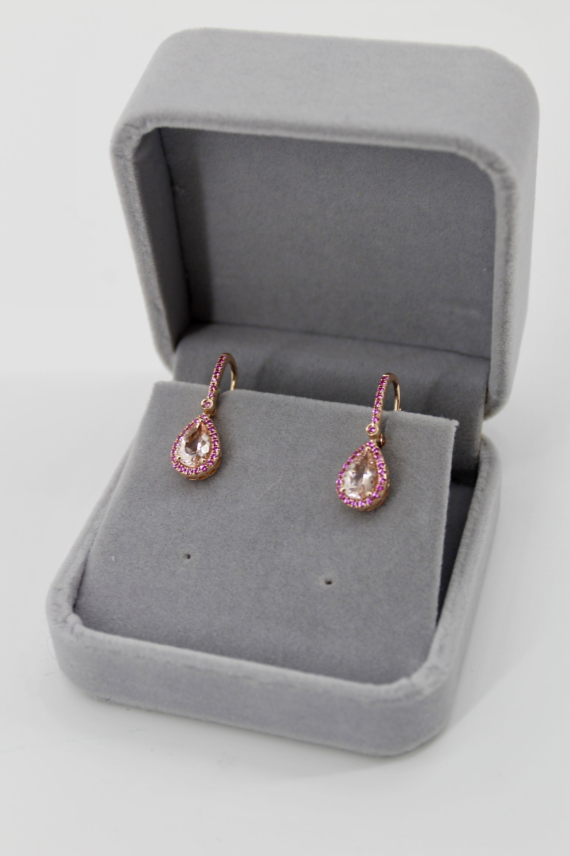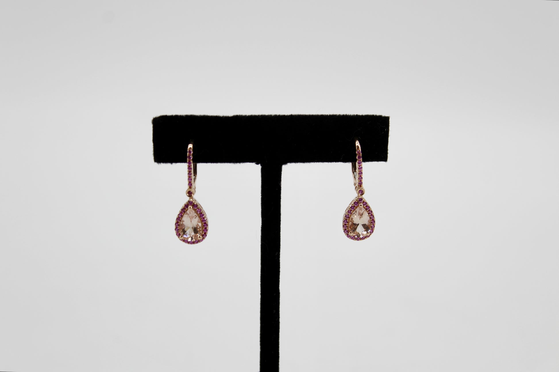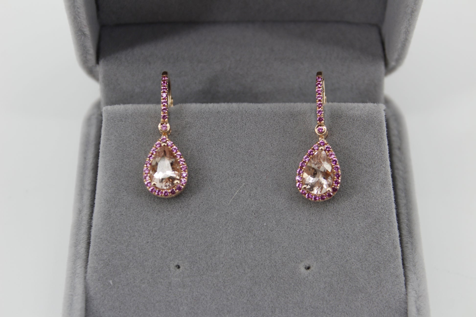 Over 3-carats of brilliant, pear-cut Morganite. Each large Morganite is surrounded by a halo of 20 Pink Sapphires, attached to a 7-stone stem, with a 1.7mm Sapphire connecting the two. Perfectly set in a rich 14K rose gold.