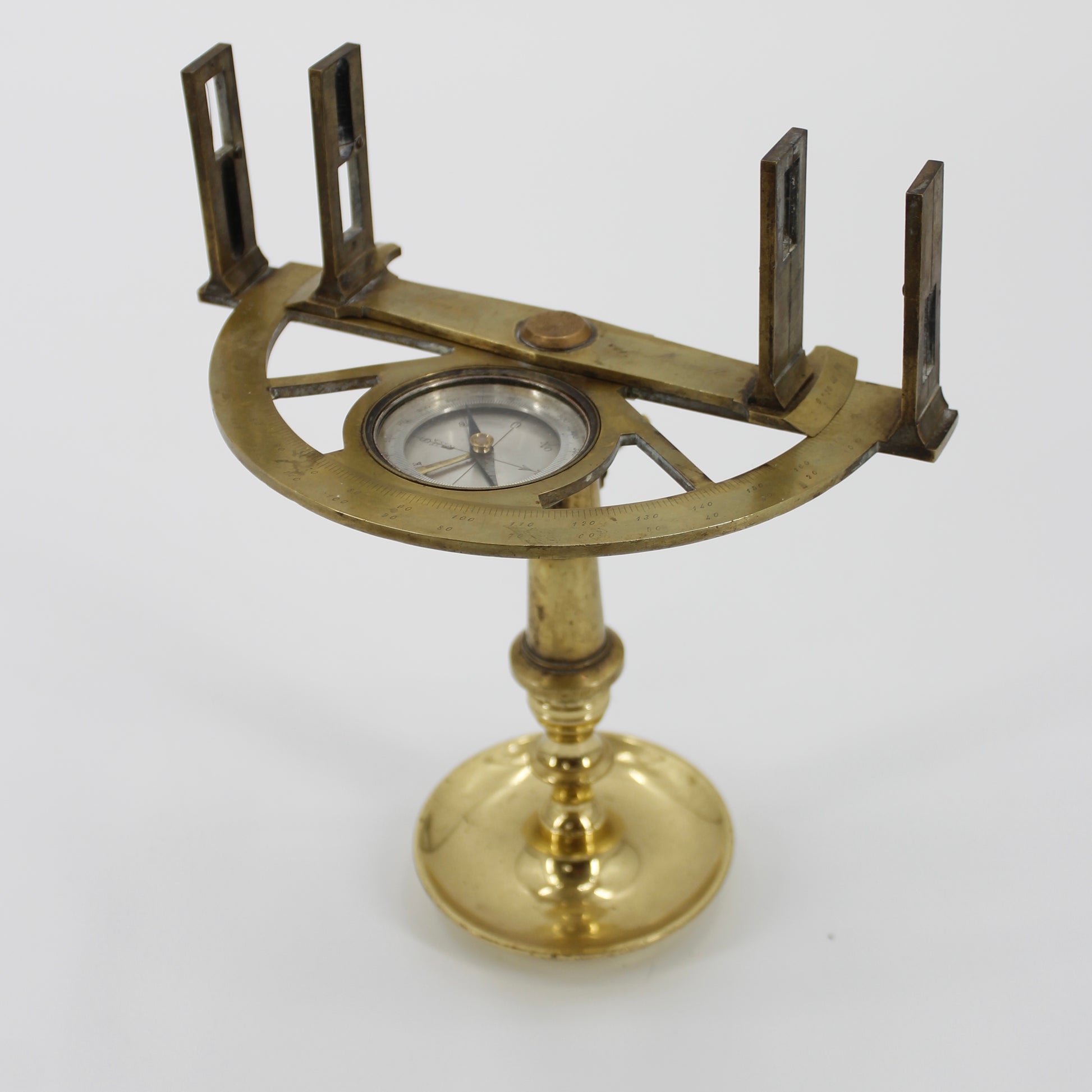 Handsome mid-19th century French Graphometer by Santi Opticien. A scarce, expertly-made piece. Atop the mount sits a 180-degree semicircular limb that is graduated every degree and numbered every 10 degrees. This graphometer features a fixed and adjustable sighting-adilades. Original & functional compass with half-blued needle on jeweled pivot, graduated every 2 degrees, numbered every 20 degrees. This piece was originally designed for tripod-mounted use; currently displayed on (and sold with) a removable ornate brass stand.