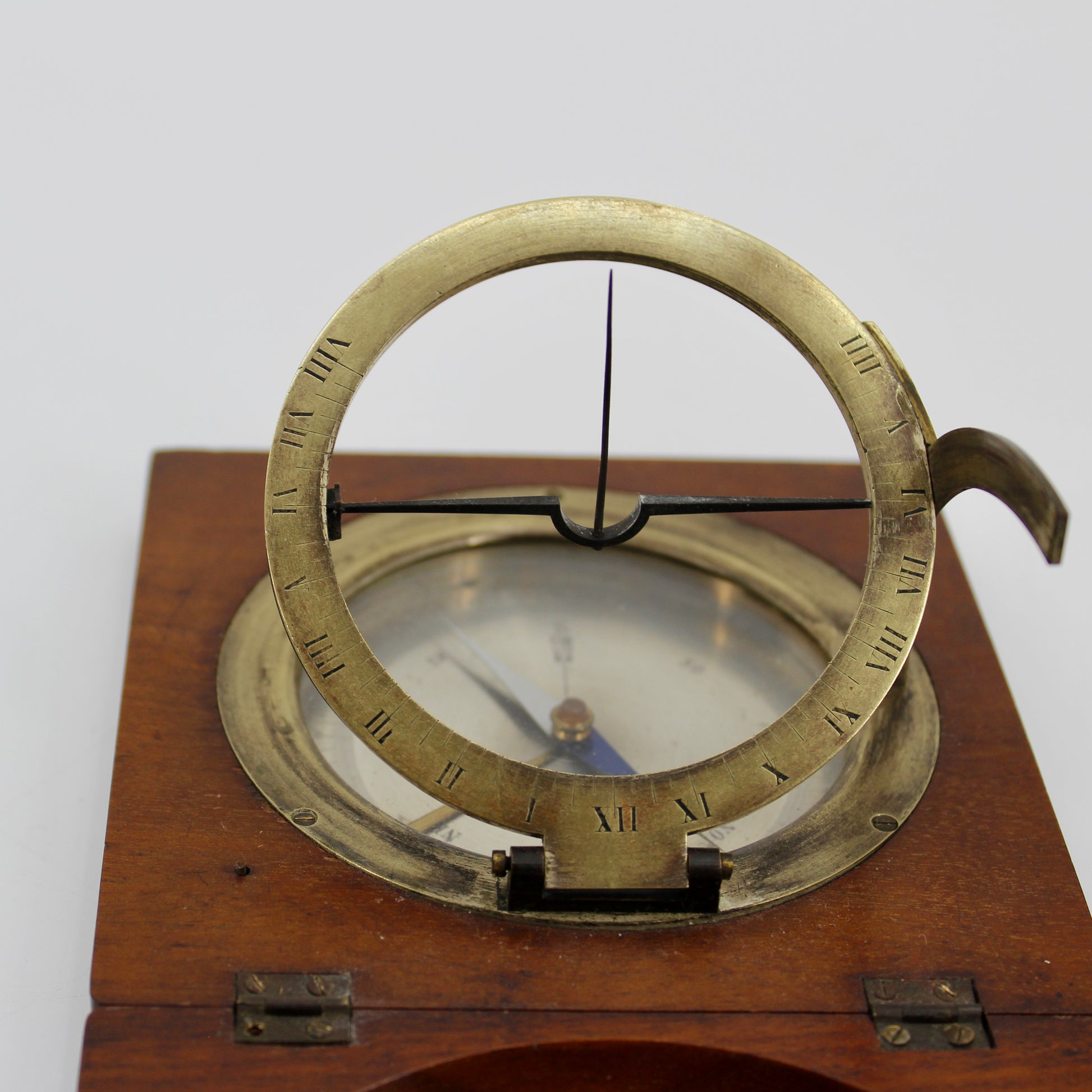 Showcasing a Unique French Mahogany boxed Equinoctial Dial. Featuring a silvered compass face with folding center needle-gnomom. The compass card is marked every degree, with larger ticks every 5 degrees, and labeled (Arabic numerals) in 10 degree increments. Half-blued steel needle on Ruby pivot. Stylized arrow indicating North. Silvered brass equinoctial ring. 'O' on East indicates likely German or French origin. This piece is especially interesting for its relatively larger size, allowing for greater accuracy and ease of use. Unsigned, circa 1800.