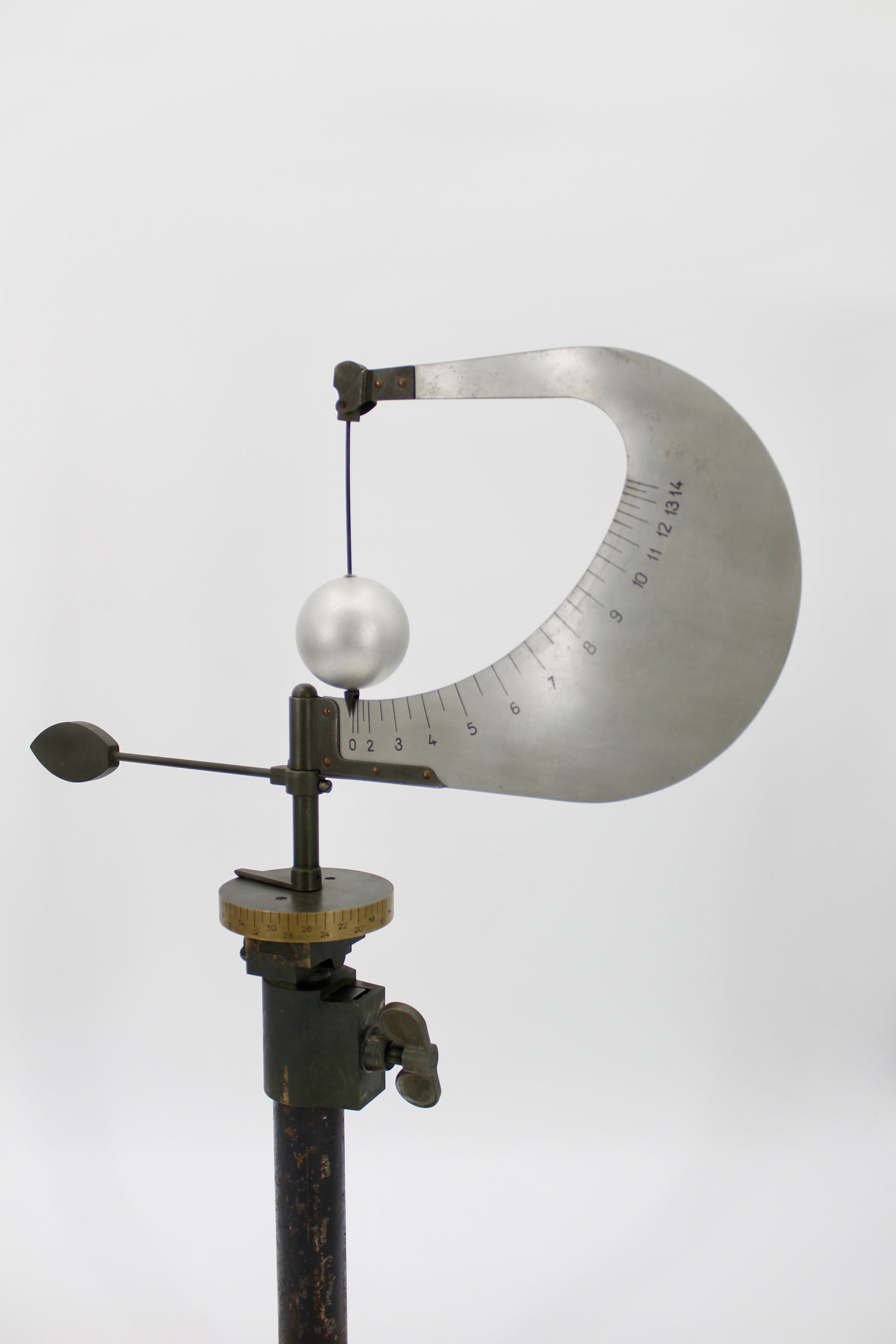 This is a modern version of Robert Hooke's 1667 Pendulum Anemometer; a fascinating device that allows for precise pressure and windspeed measurements without need of electricity. Utilized during the Antarctic Division by civil engineers in WWII, this vintage type M.1991/A aneroid barometer features a calibrated steel base and arms, with aluminum wind vane numbered 0 to 14, and hollowed brass ball.
