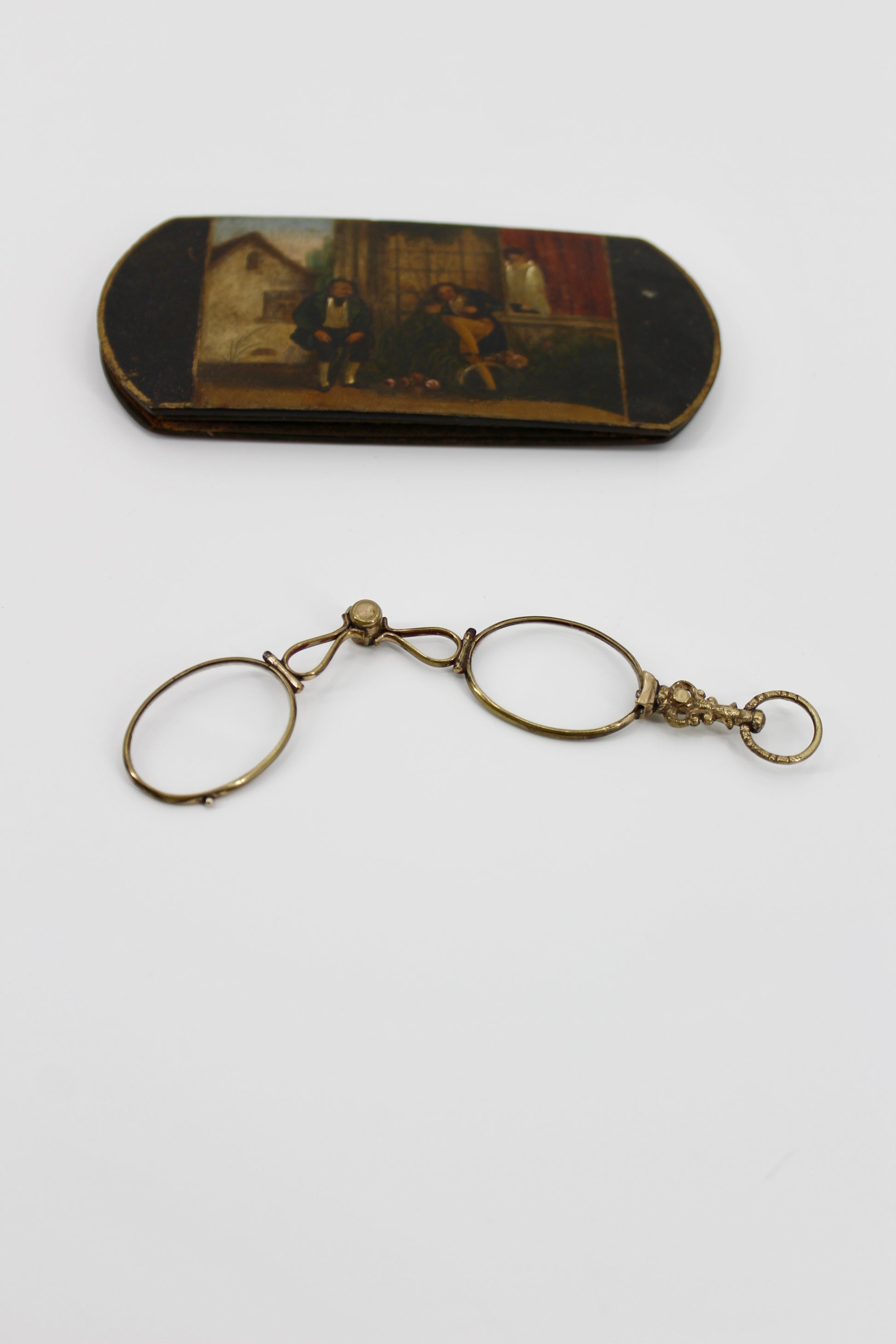 Victorian 14K Gold Vermeil Lorgnette Folding Glasses. English-made, circa 1890. With ornate hand-painted Scenic case (Case is VERY delicate). The ring loop for ease-of-use on necklace or pocket-chain is uniquely engraved to resemble a Corinthian column. Lorgnettes fold into a tension-lock on ring-loop.